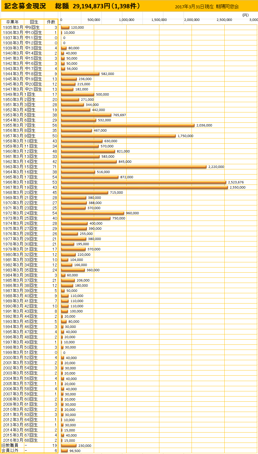 しかし上記の事業を具現化するためには多くの資金を必要といたします。つきましては甚だ恐縮ではありますが、同窓会会員の皆様にお願いして寄付を募ることといたしました。募金の趣旨を十分ご理解賜り、ご協力くださいますよう謹んでお願い申し上げます。