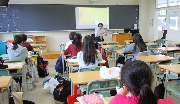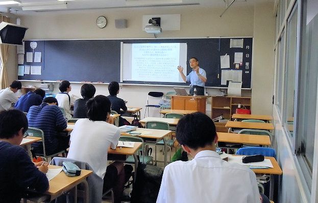 「キャリアガイダンス」は昨年度までは毎年2月、視聴覚室に1年生全員320名を集めて、文系、理系各1名の同窓会員がそれぞれ1時間ほど講演していました。学校では、今回はこれまでと時期も内容も大幅に改め、文理選択目前の9月、各分野の同窓生10名が1年生の教室で質疑込み50分の講演をほぼ同一内容で2回行い、生徒は教室を変えて関心のある講義を2種類受講することしました。