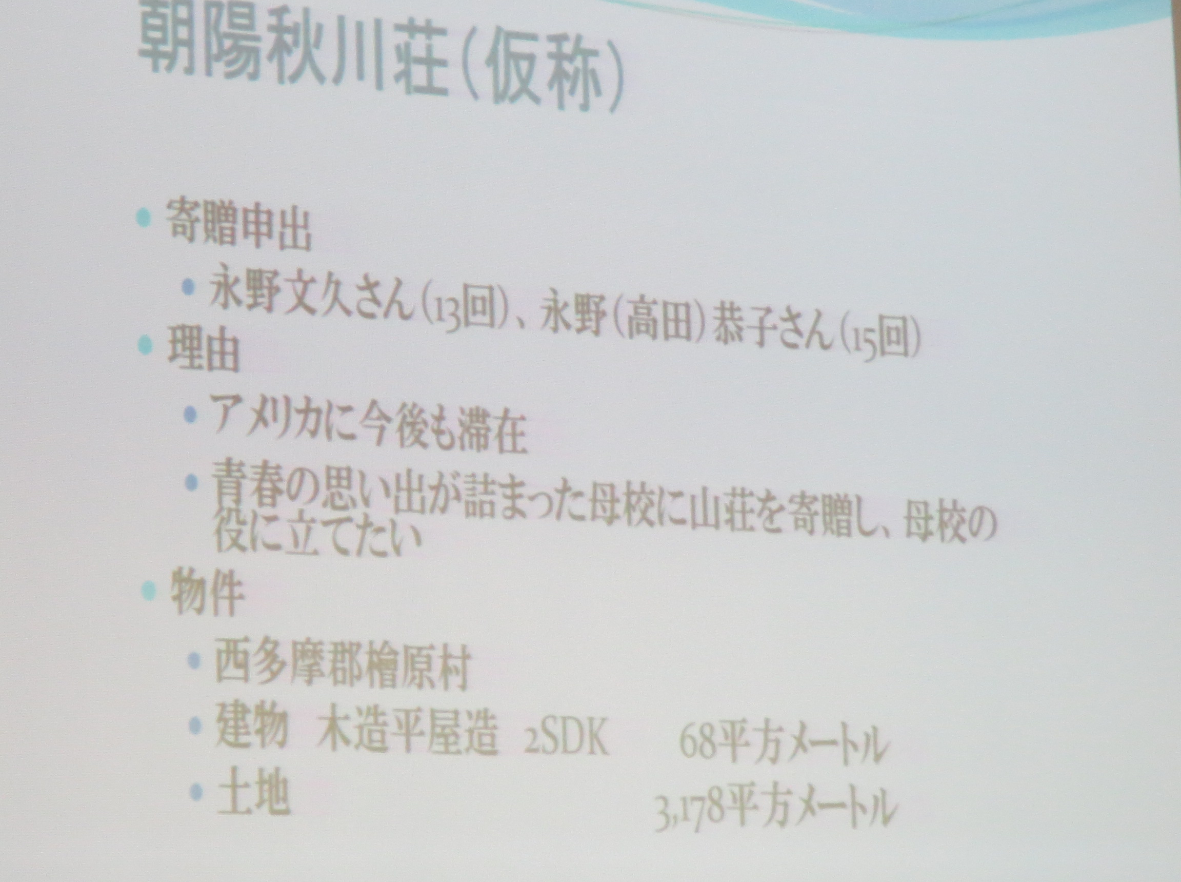 同窓生からの寄贈申し出があった別荘については維持経費などの検