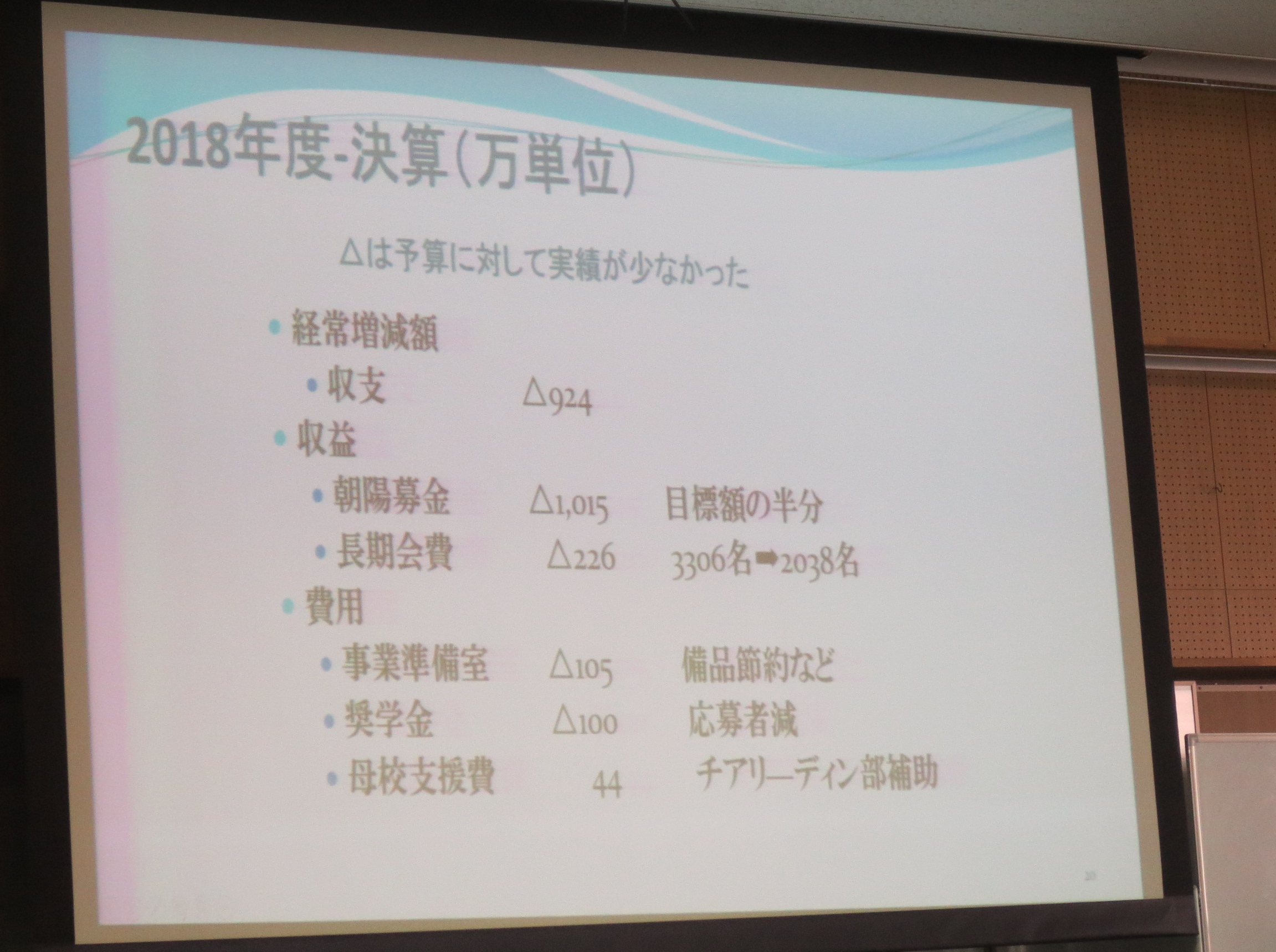 ◆ 議案-3 2018年度決算報告 詳細は会報「朝陽」68号76頁参照