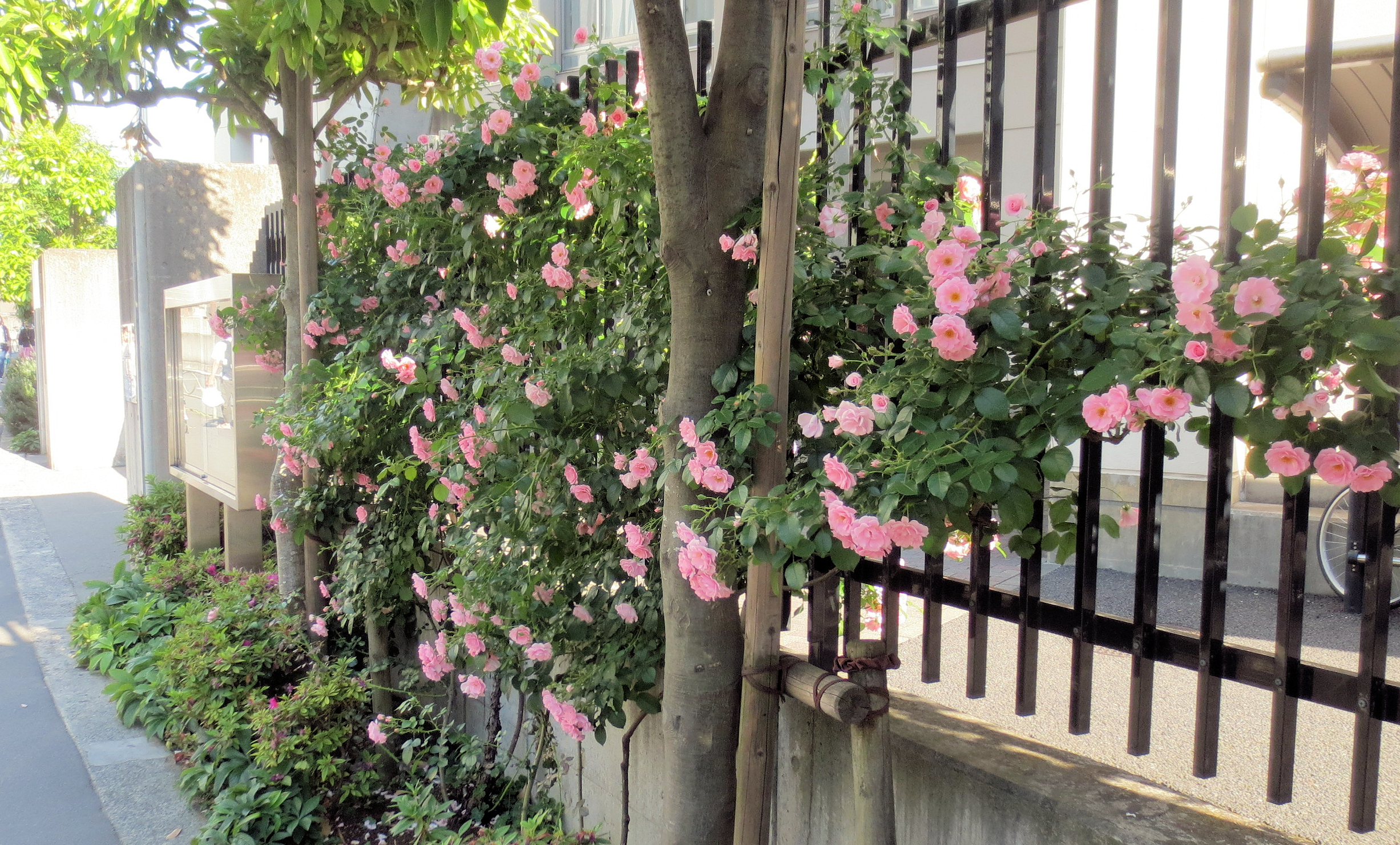 正門近くに咲く 朝陽バラ会が丹精込めたバラ