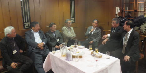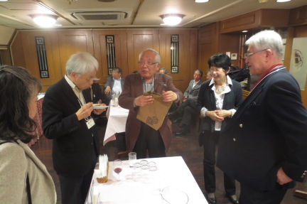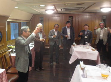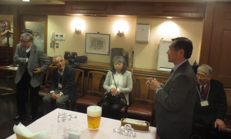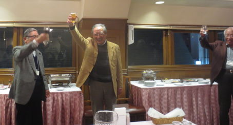 | 河東節のお話に花が咲きました。 | ゴルフから駆け付けた吉村幹事長とあらためて乾杯 |