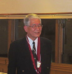 | 西出事務局長による式次第説明 | 橋本恵堅(よしみ)同窓会顧問による乾杯ご発声 |