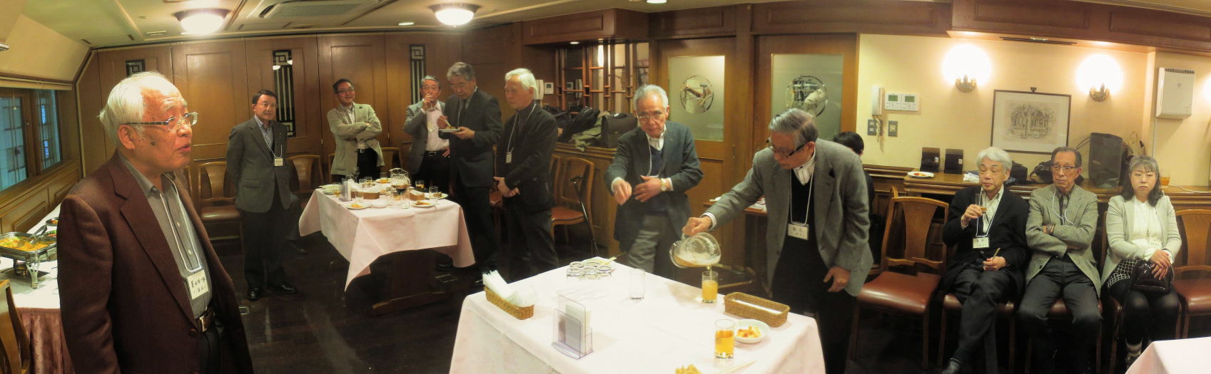 | 今回の講演は麦田浩一郎(左端、16)さんによる「歌舞伎『助六』への出演」、團十郎公演では河東節の歌いで歌舞伎への出演機会があるそうです。良き時代の旦那芸のようで、もう300年近くの伝統があるそうです。 河東節のさわりも録音およびご本人発声で聞かせていただきました。節回しがずいぶんと難しい。 |