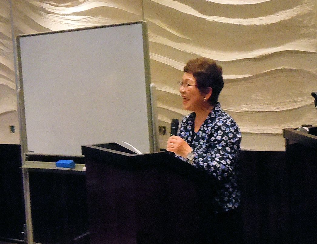 演題は「何にも、どんな時にも挫けない、難しければ難しい時ほど勇気を持って立ち向かう度胸と自信ができたのはアナウンサー生活のお蔭」という意味でつけたそうで、その名のとおり、最後には、滑らかにしゃべるための準備としての「五十音の滑舌」の実習を会場内の全員で合唱して楽しい講演を締められた。