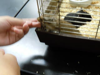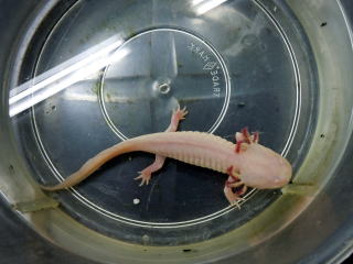 生物部 の 5年目のウーパールーパー君と人の指からエサを食べる砂ネズミ君