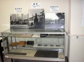 初代校舎の写真と制帽・校章など