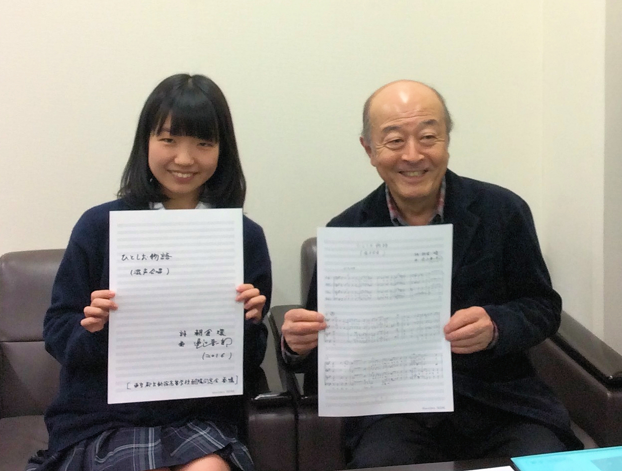 このあと、同窓会事務局で作詞者の3年生朝倉環さんと記念写真を撮影。