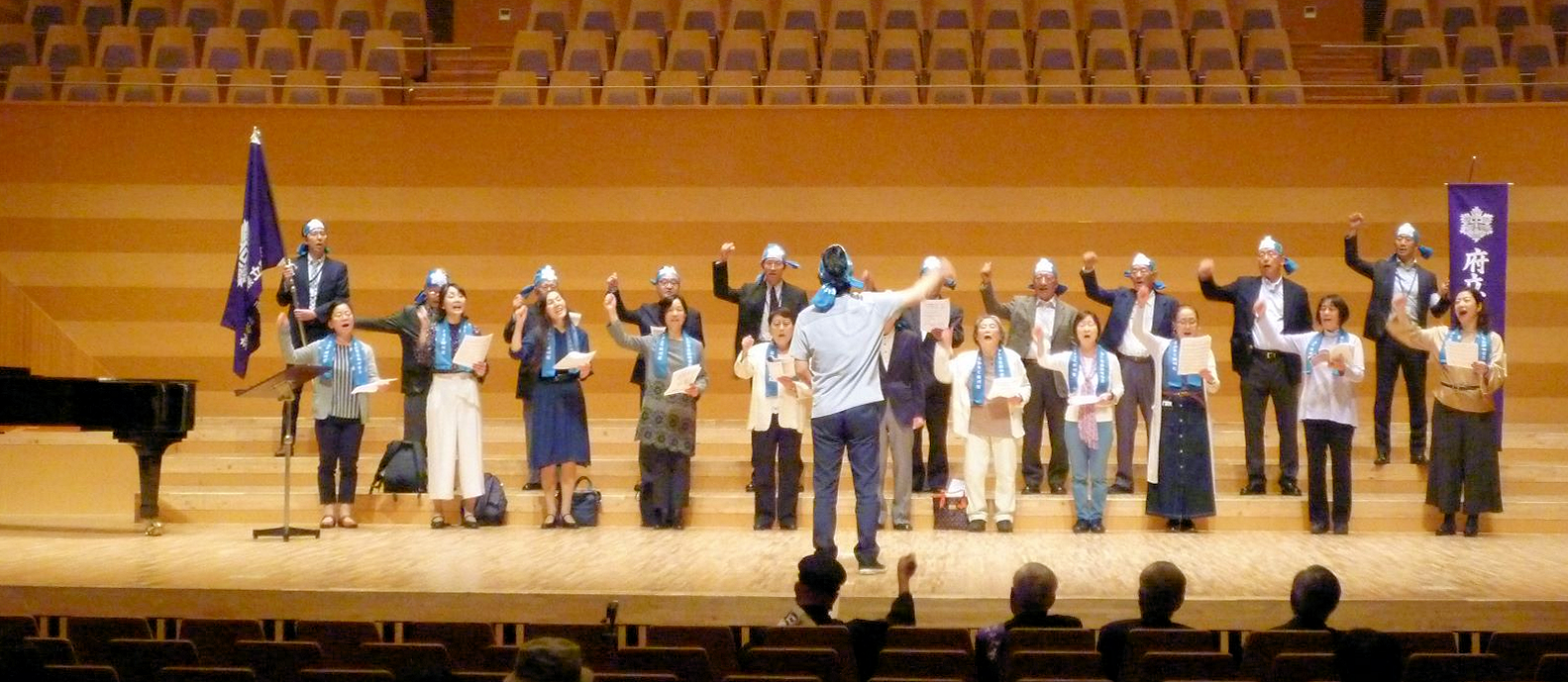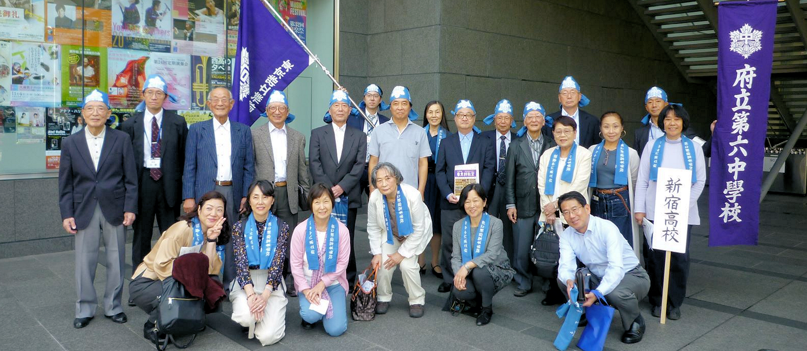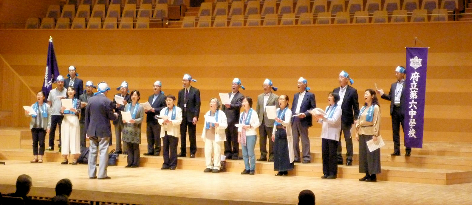 今年は、中間考査中の日曜日ということで、現役音楽部員の参加はありませんでしたが、 朝陽合唱団と六声会を中心としたOB・OGのメンバー大勢の方々の参加を得て、 旧制六中校歌、新宿高校校歌、健児の歌の3曲をご披露していただきました。