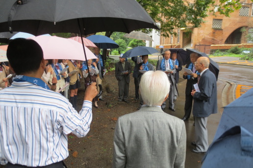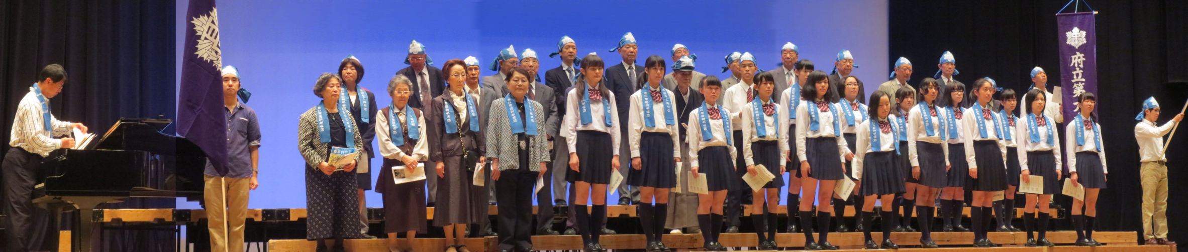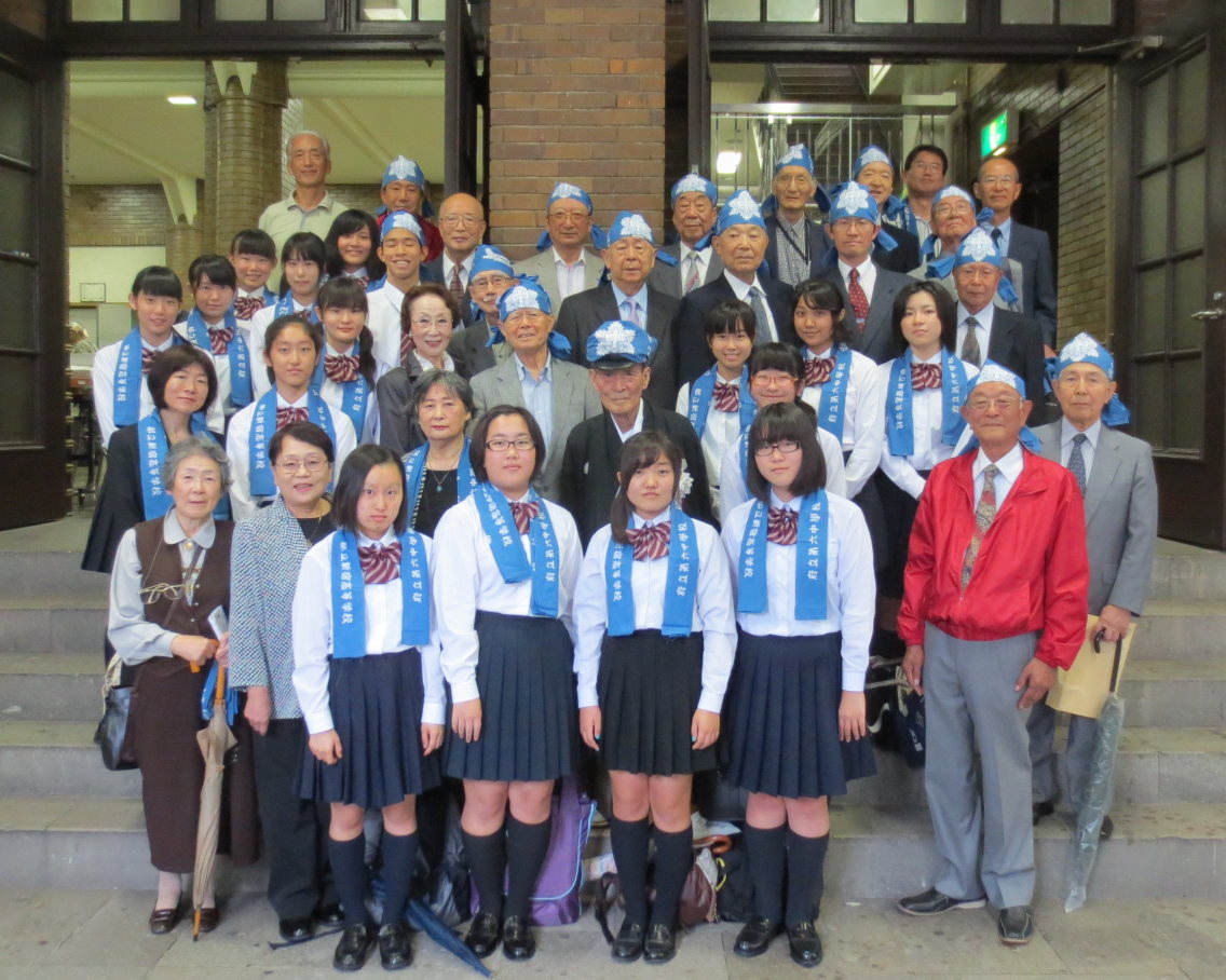 ![]() 舞台上に勢ぞろいした新宿高校の参加者の皆さん。現役の諸君も一緒に舞台に上がってくれています。指揮は山本俊次郎さん(5)、ピアノ演奏は母校小峰和則先生です。 |