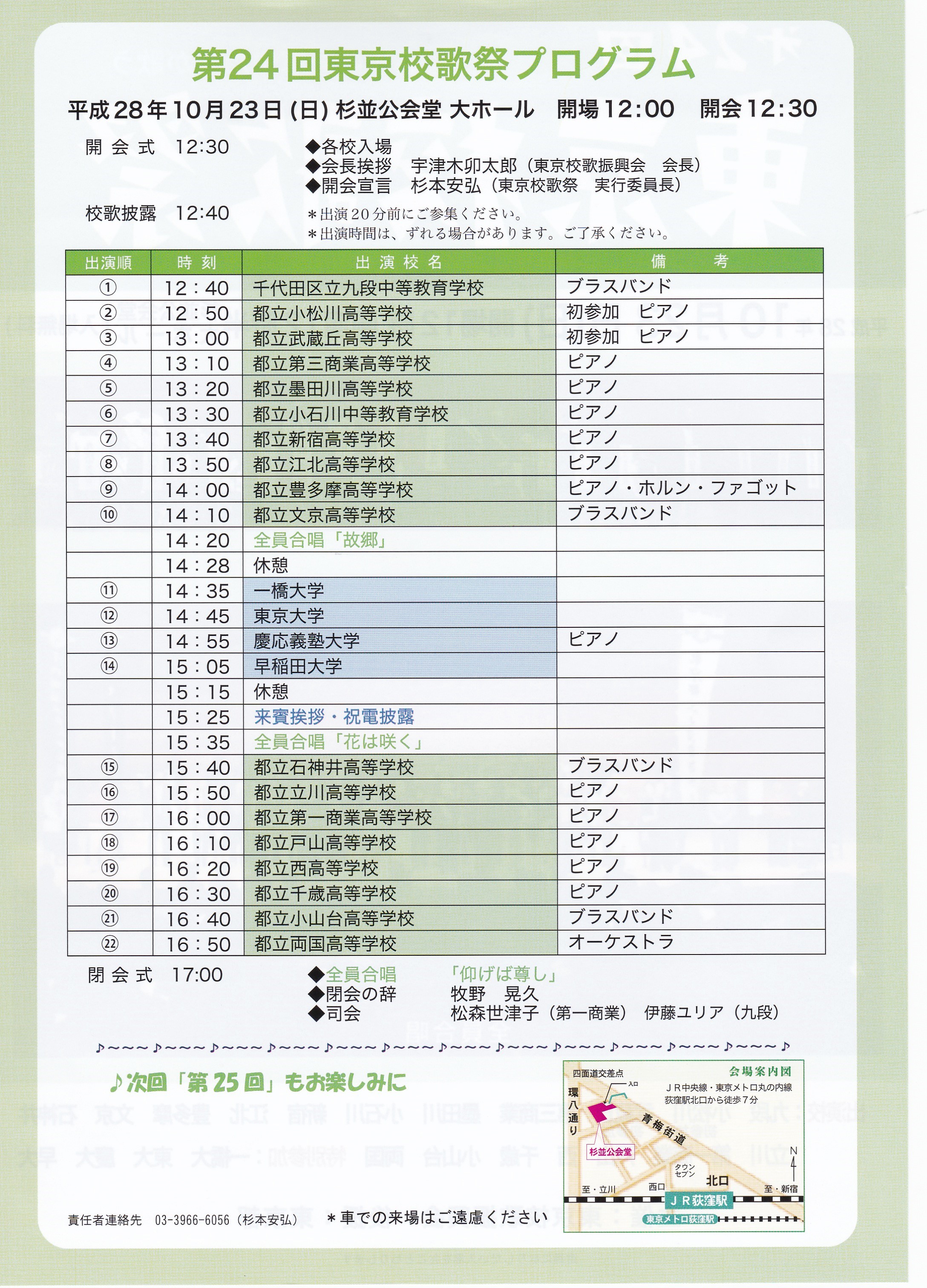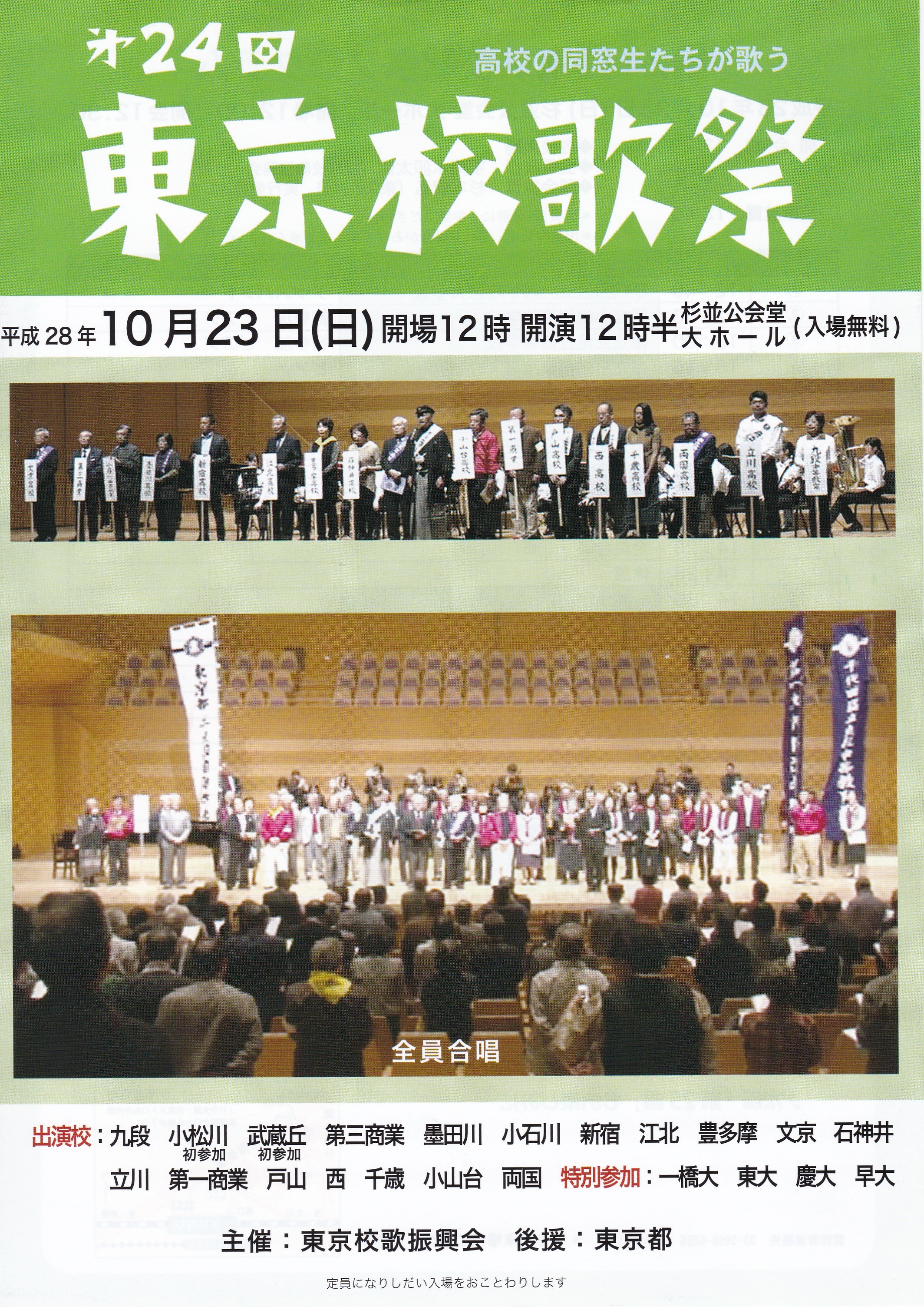 第24回東京校歌祭が今年(平成28年)も10月23日(日)、杉並公会堂で行われます。