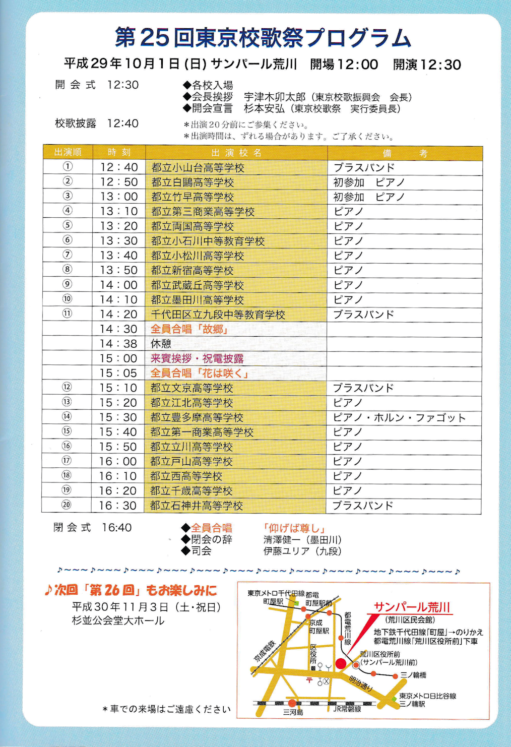 今年で第25回目となった東京校歌祭は、初めて「サンパール荒川」を会場に10月1日(日)12時30分から行われました。
