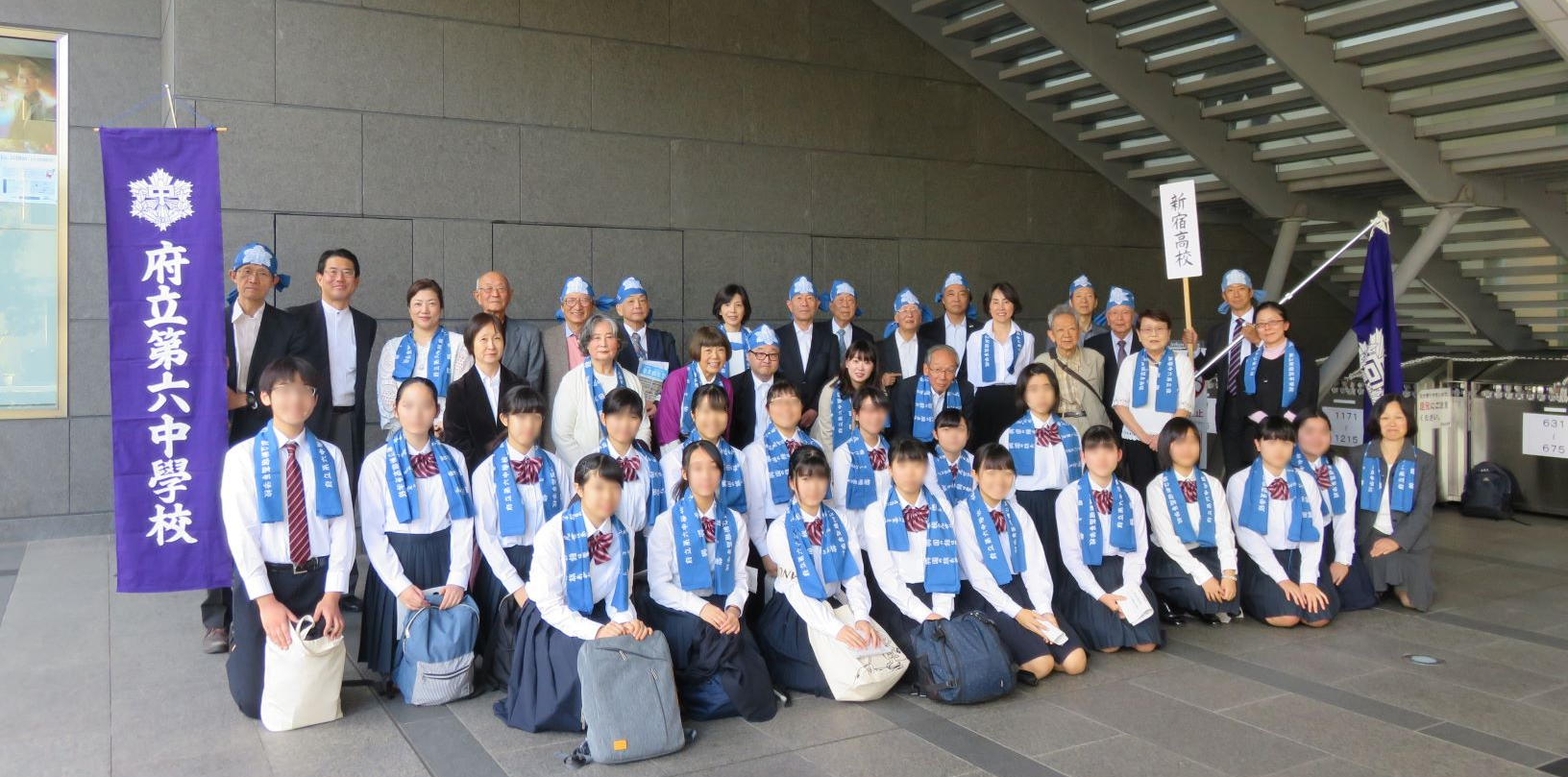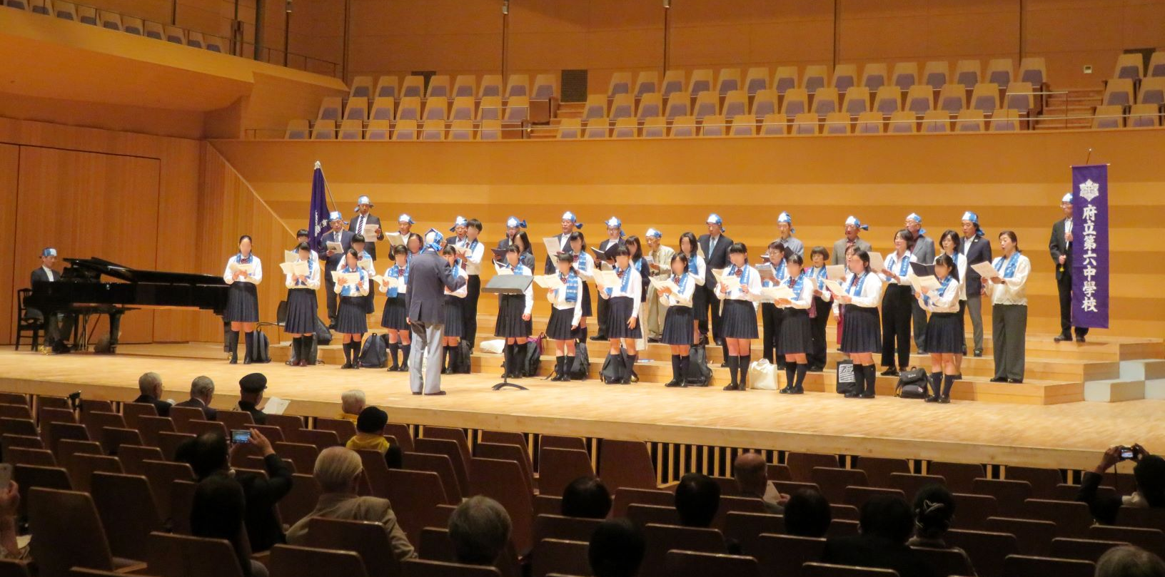 歌唱指導と伴奏は今年も母校音楽教師の小峰先生にお願いし、現役音楽部員18名の参加を得て、朝陽合唱団と六声会を中心としたOB・OGのメンバーが声を合わせて、旧制六中校歌、新宿高校校歌、健児の歌の3曲を力いっぱい歌いました。