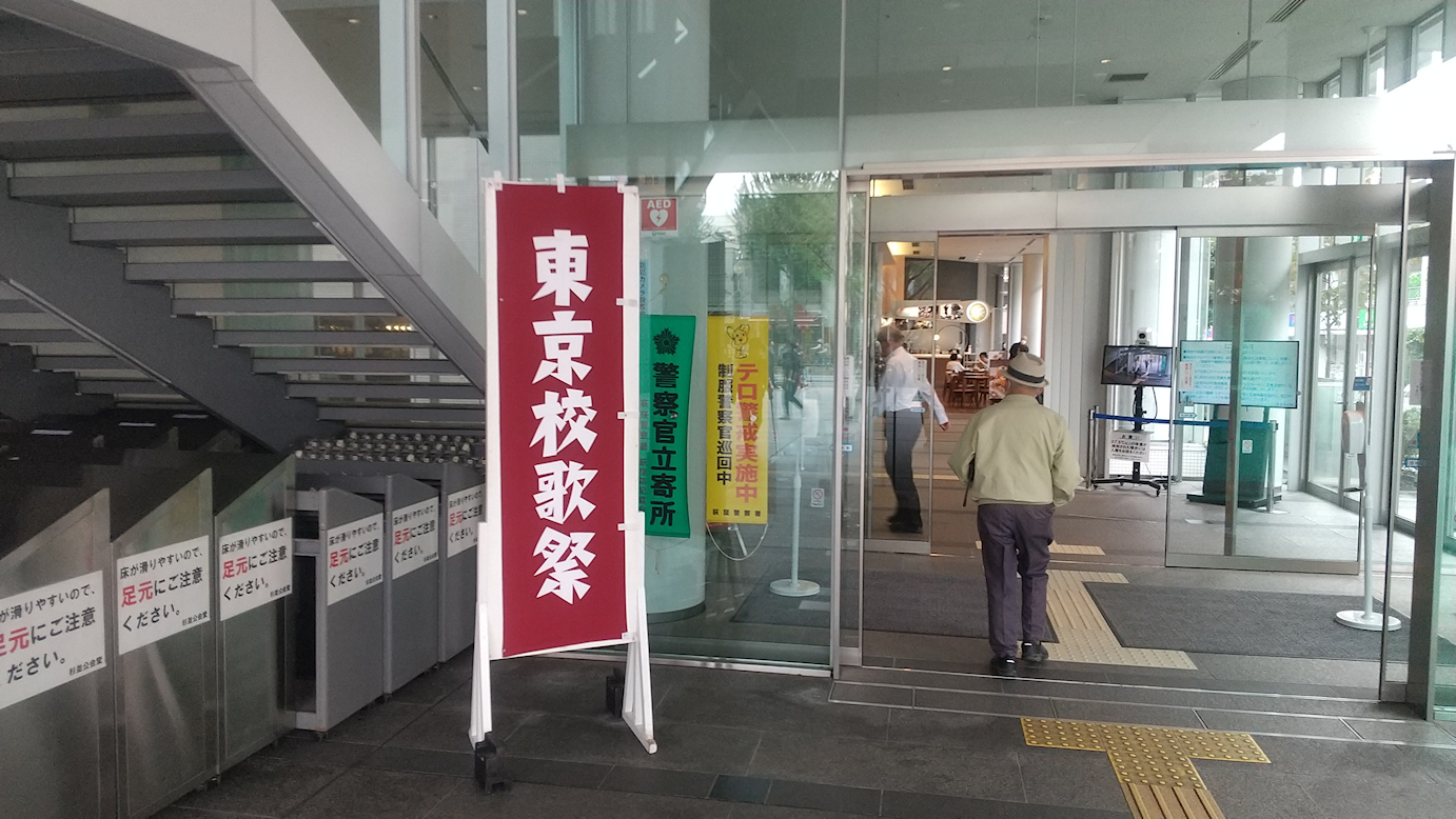 公会堂入り口に掲げられた東京校歌祭の看板