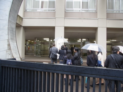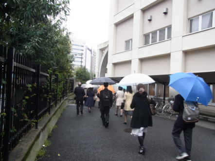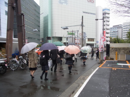 雨の中を入学式に急ぐ新入生と父兄