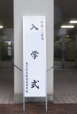 校舎脇の垂れ幕と入学式の看板