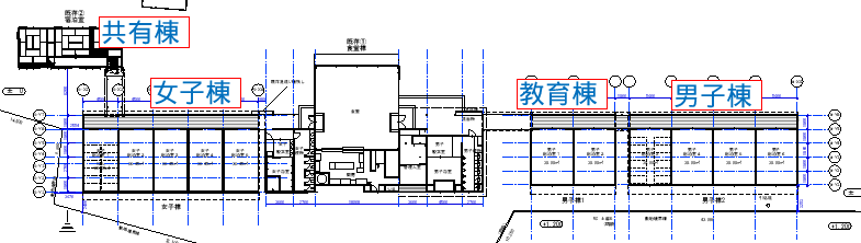 新築棟は、館山寮再建に伴い新築された下図の男子棟、教育棟、女子棟の総称ですが、教育棟には一般宿泊はできません。宿泊申込み時に、男子棟・女子棟の指定は従来通りできません。