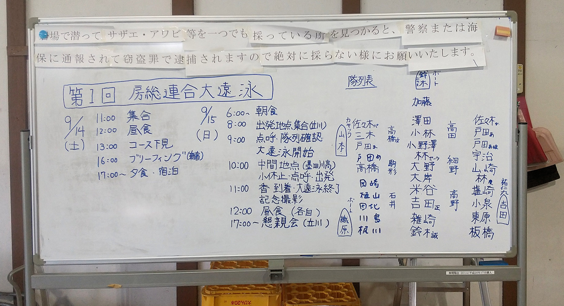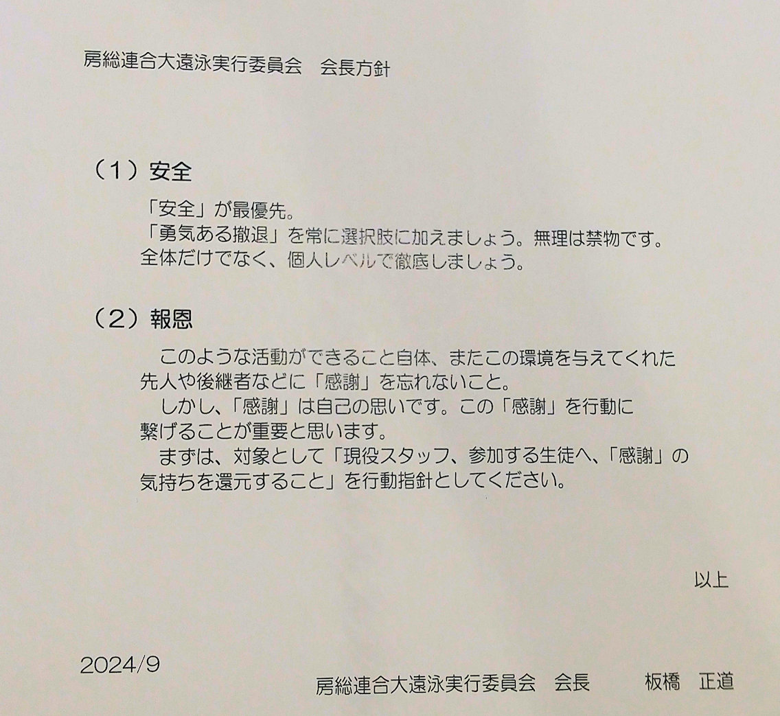 今回の大遠泳の日程および遠泳隊列の確認