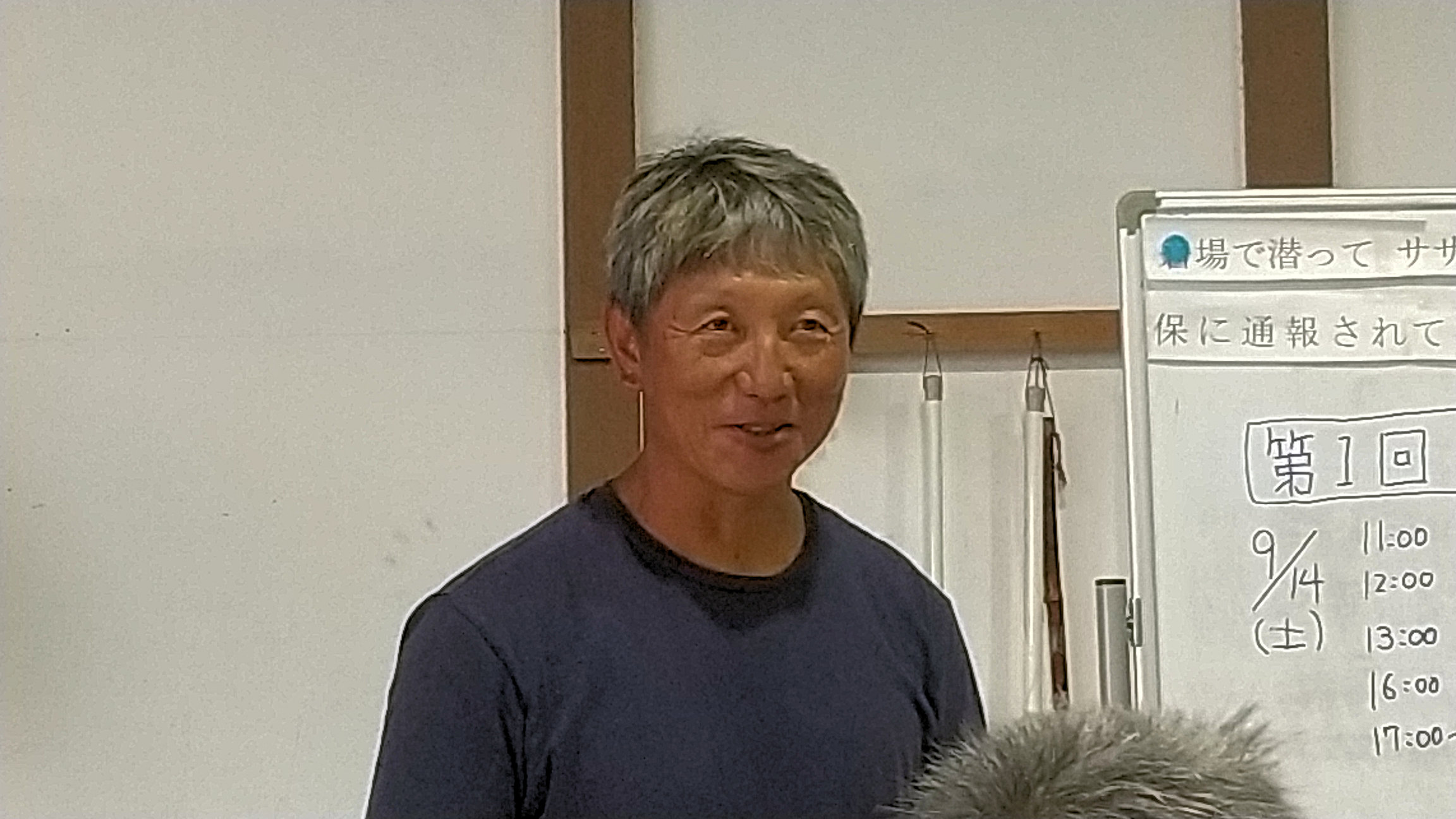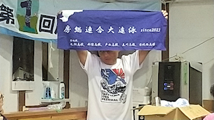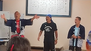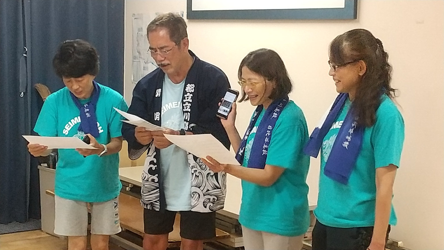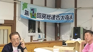 房総連合大遠泳の記念手拭いの紹介をする新宿高校38回細野さん