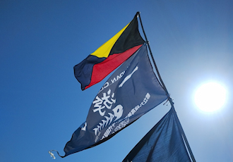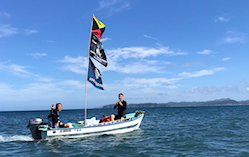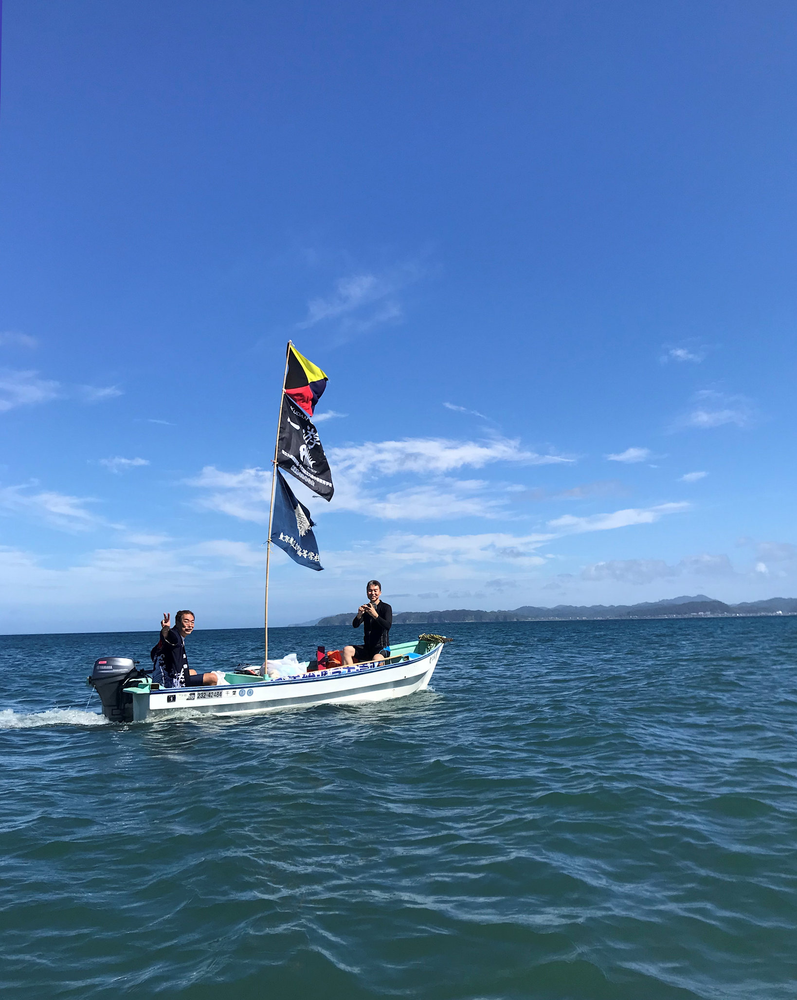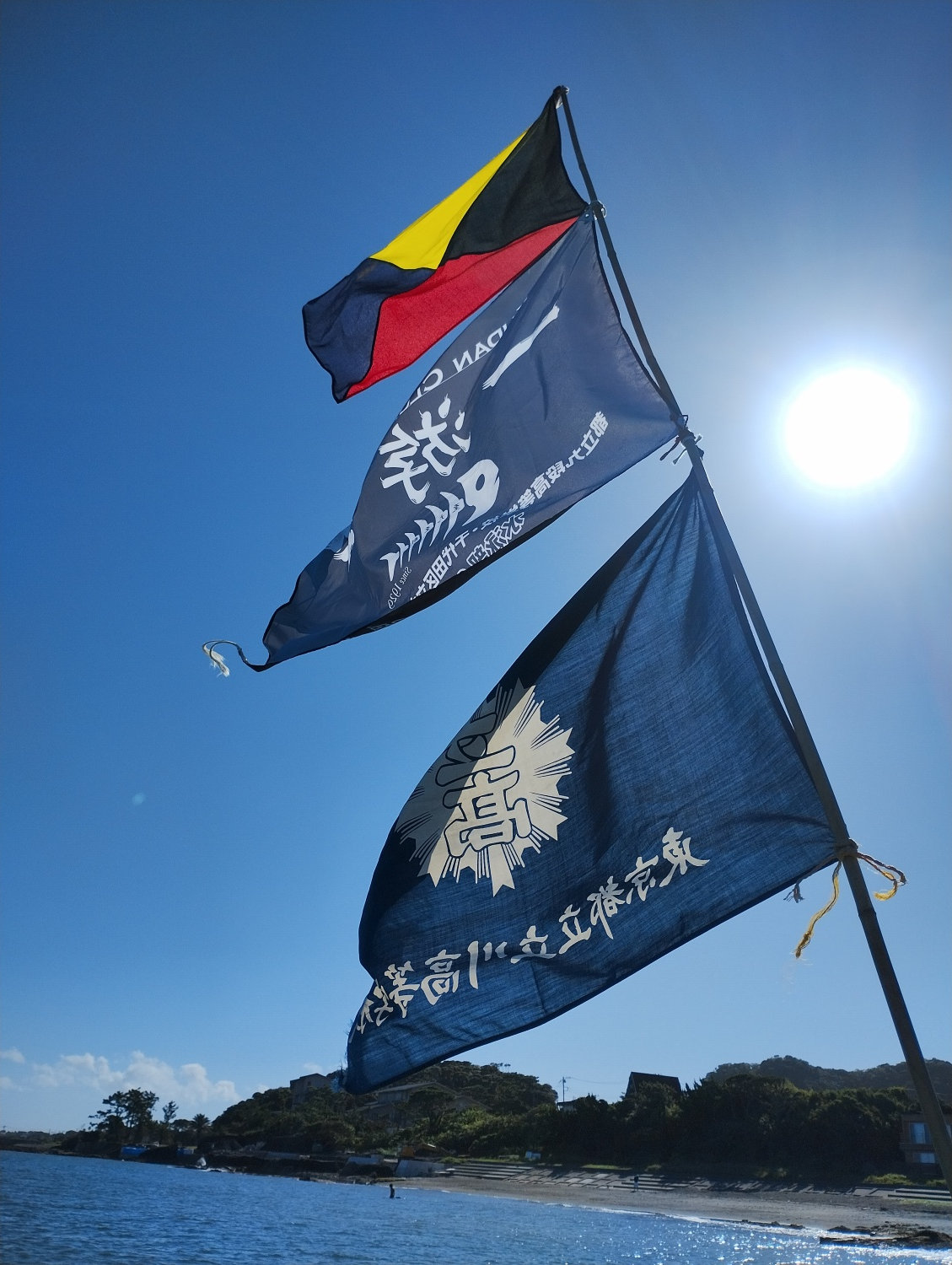 祐仁丸に掲げられたZ旗(新宿高校)、九段高校、立川高校の旗