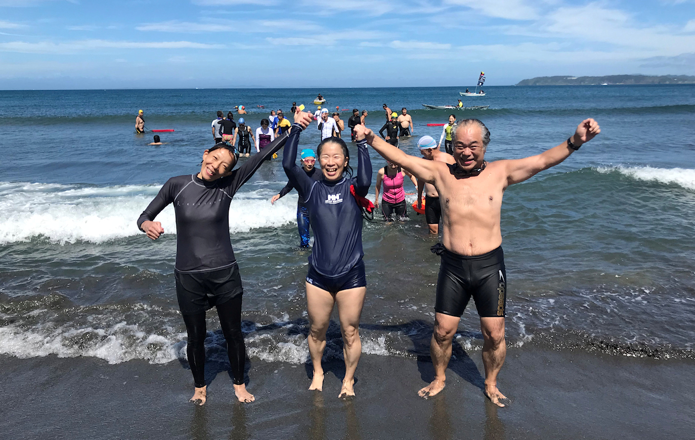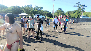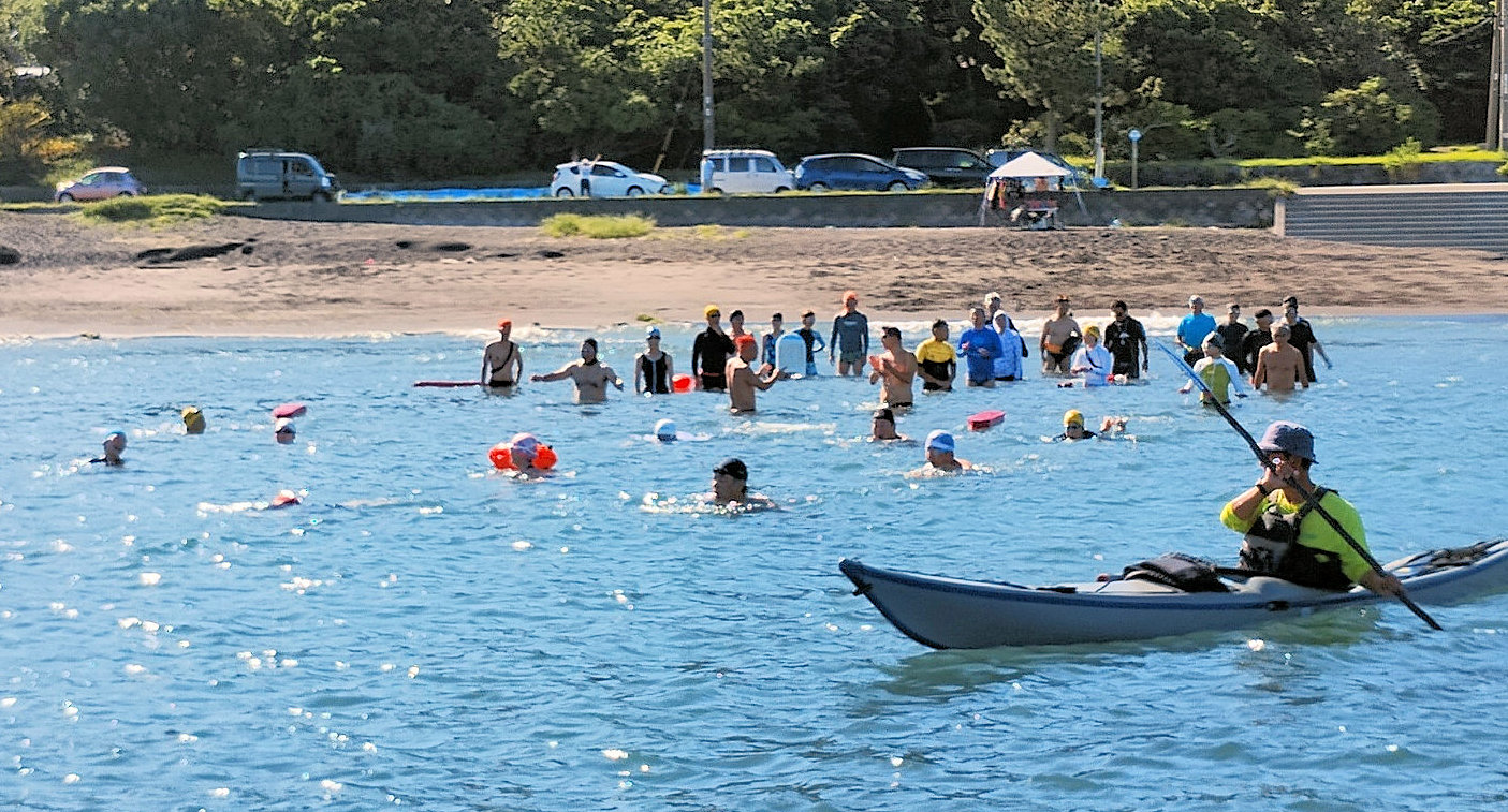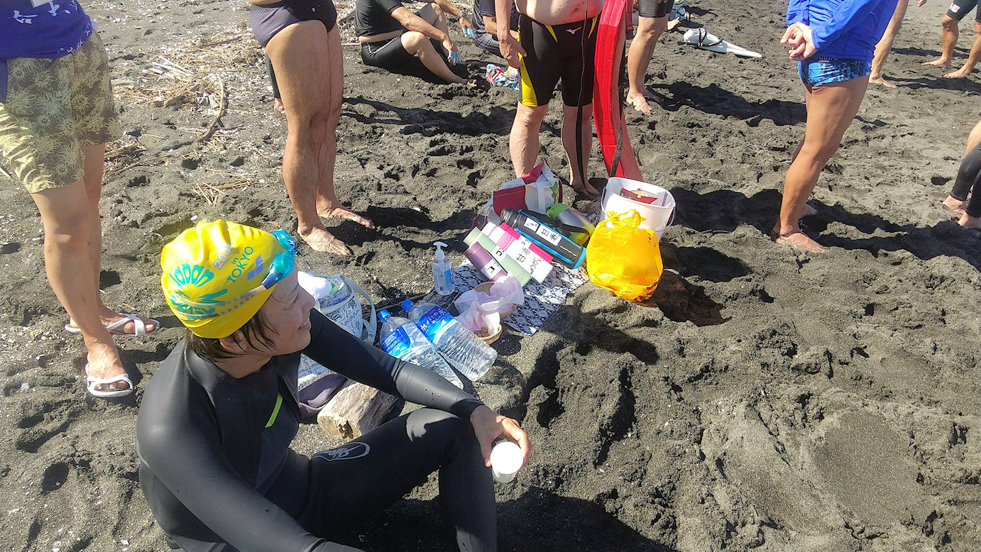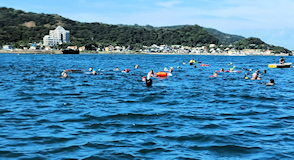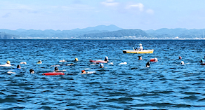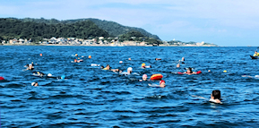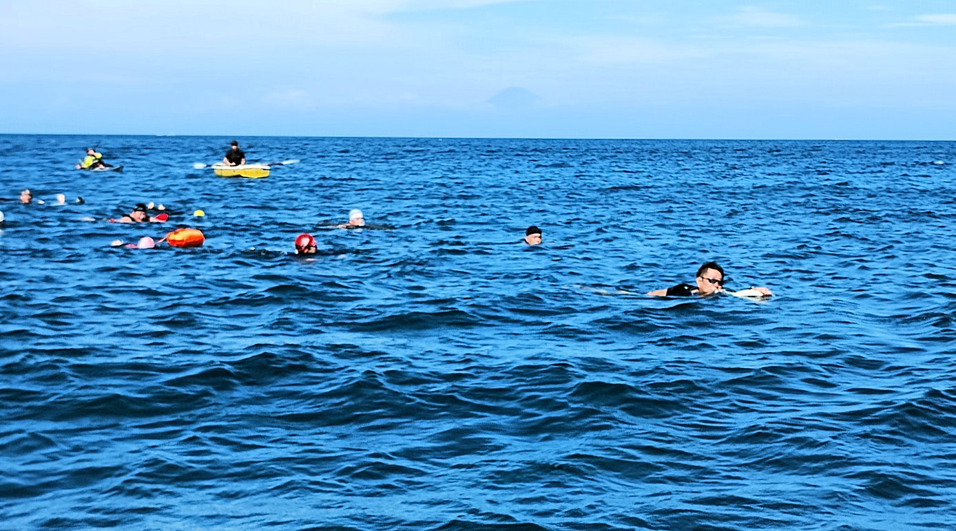「遠泳を初めて拝見しました。富士山を拝みながら進む隊列は美しく、また浜に到着した皆様