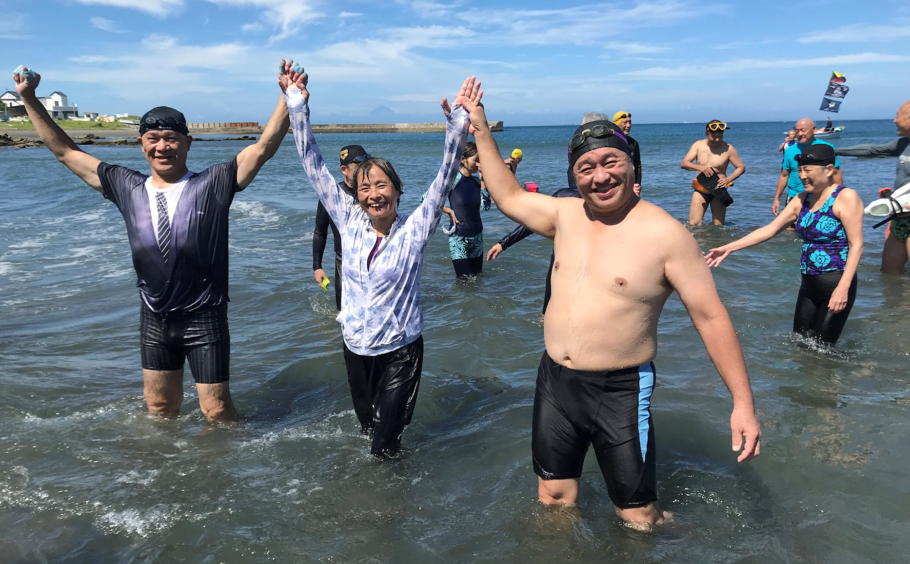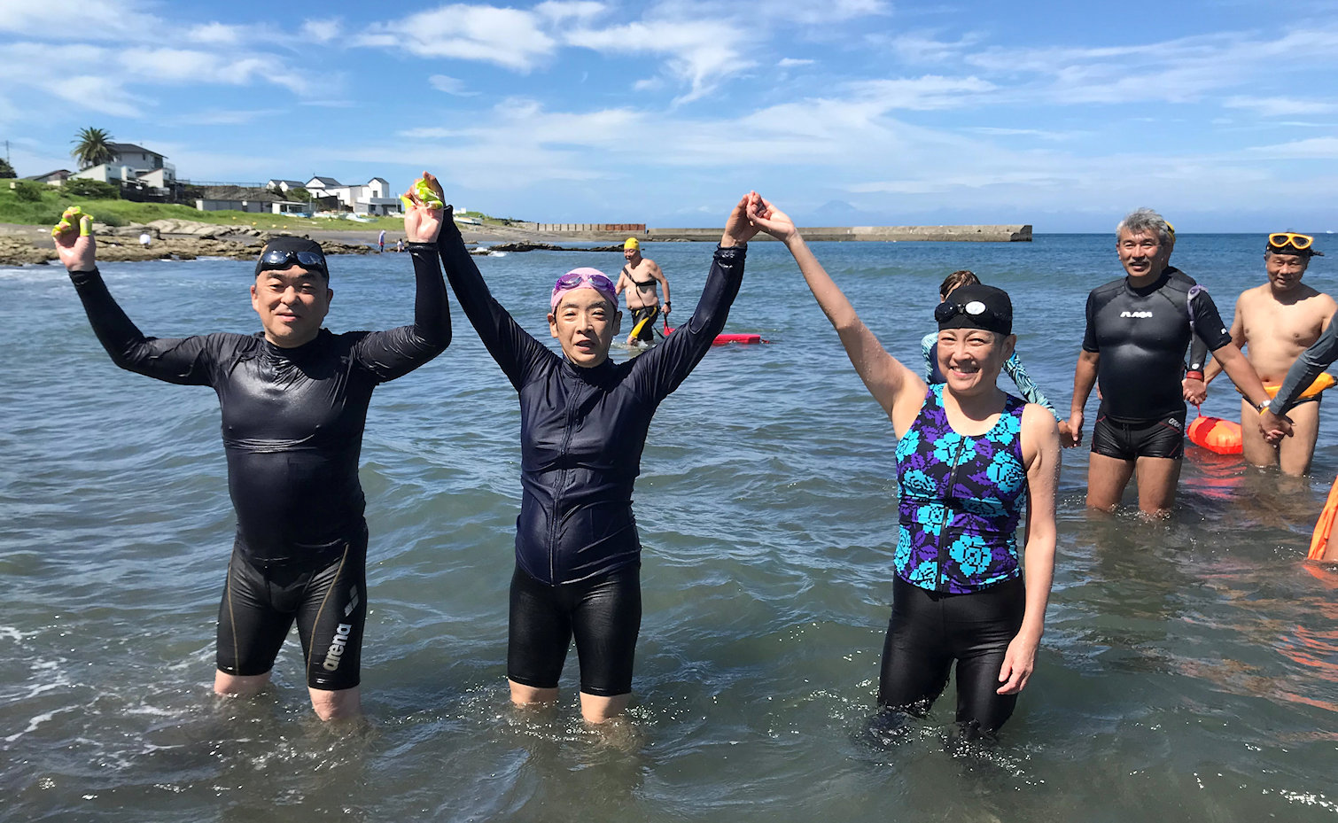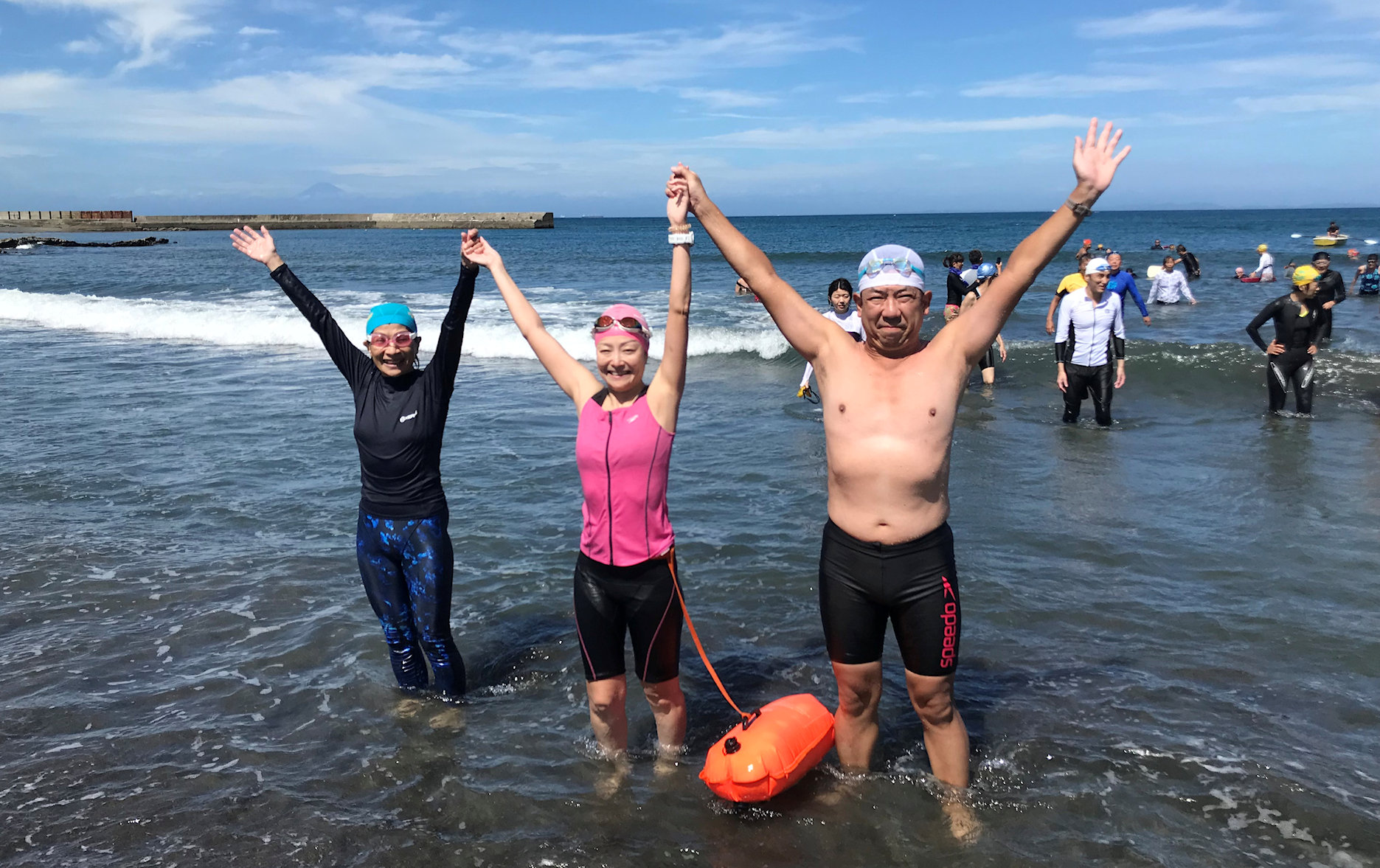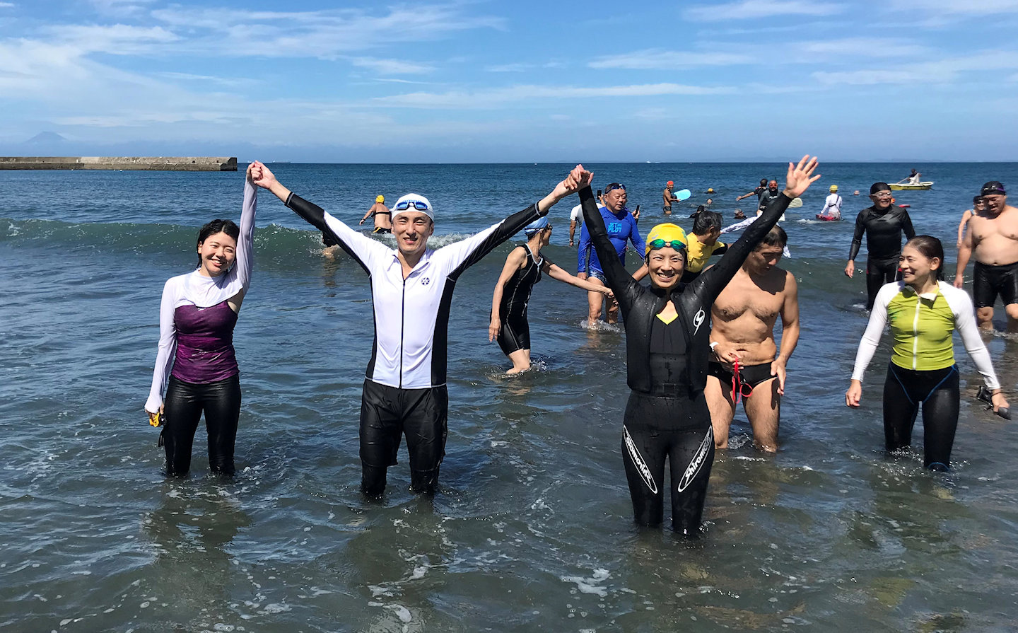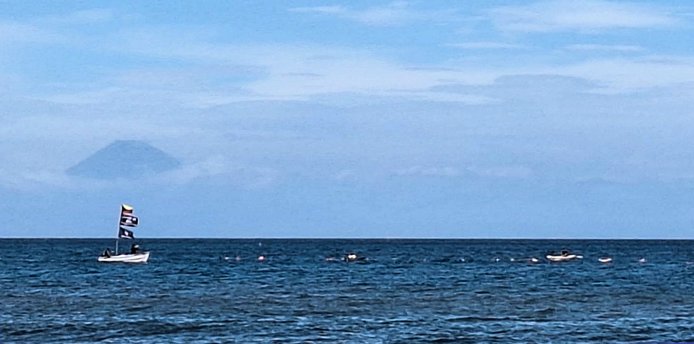 「遠泳を初めて拝見しました。富士山を拝みながら進む隊列は美しく、また浜に到着した皆様