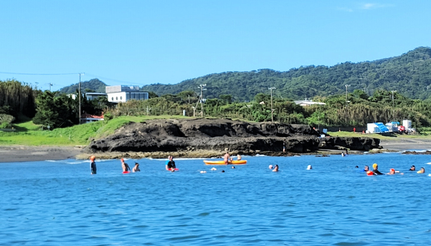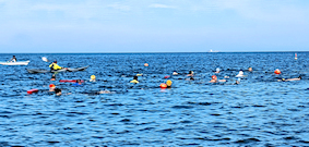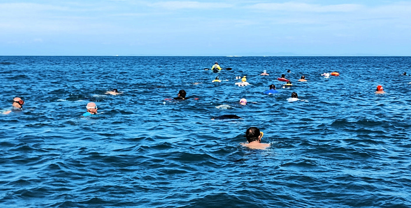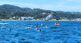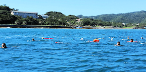 出発地点の見物海岸から遠泳コースを望む 途中小休止地点を経由しておおよそ3km弱のコース