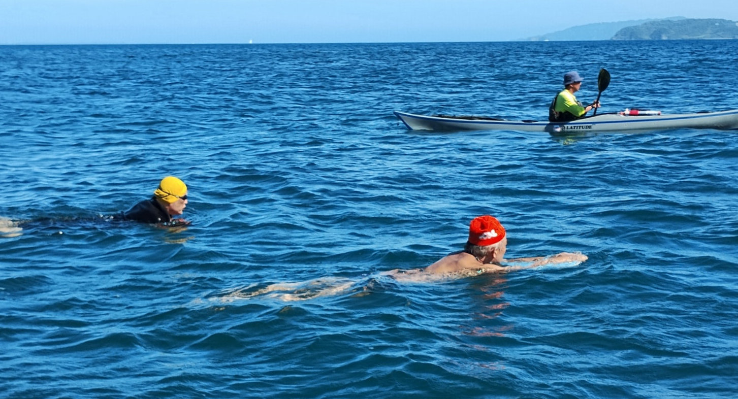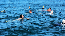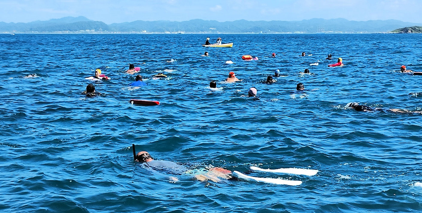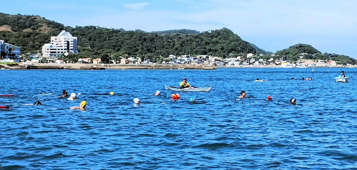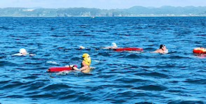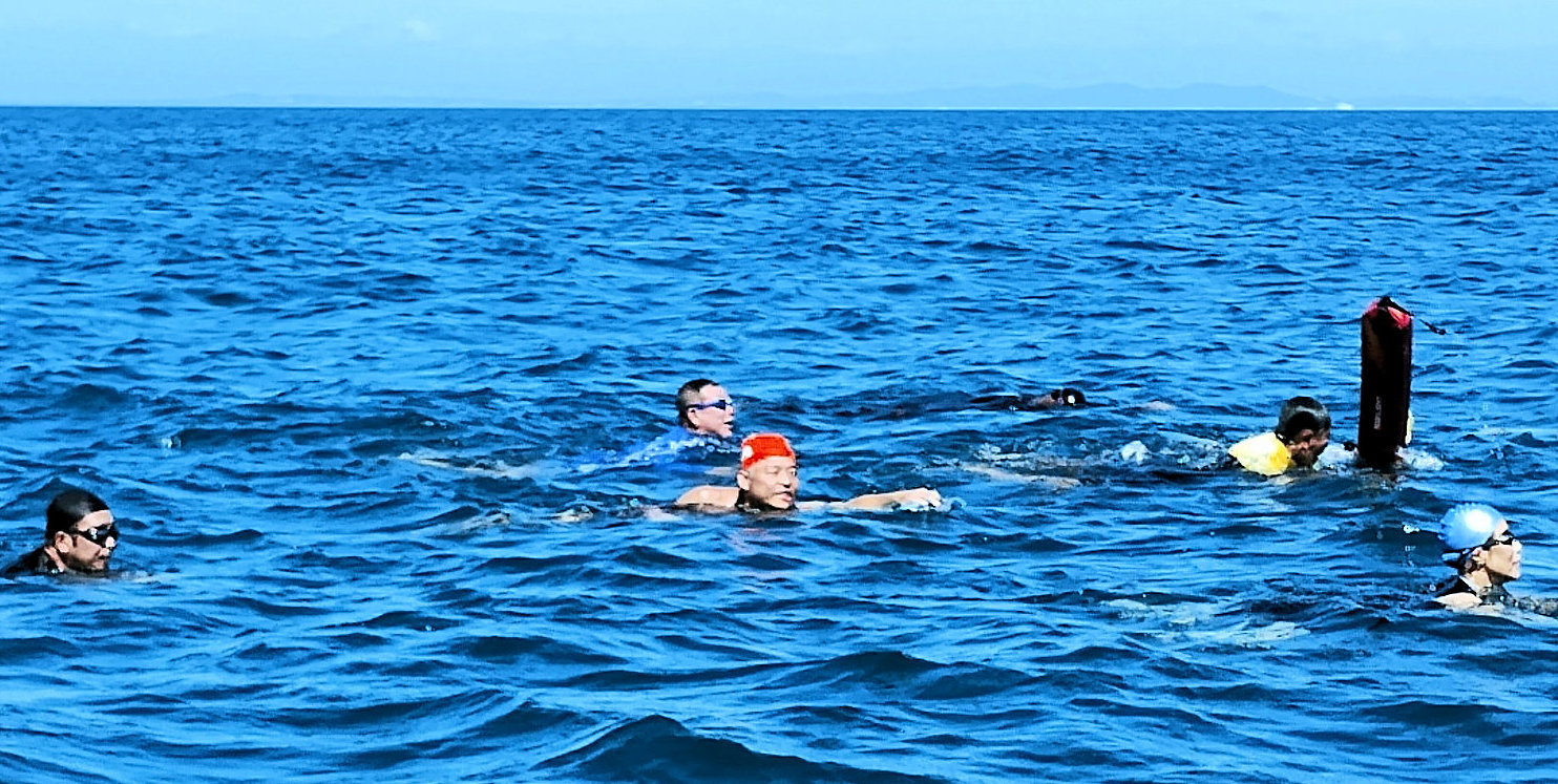 遠泳初挑戦を励ます仲間たち
