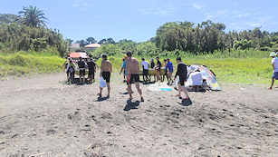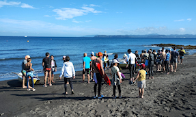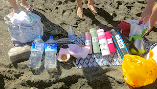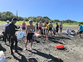 新宿高校館山寮の前の浜にゴールして記念撮影