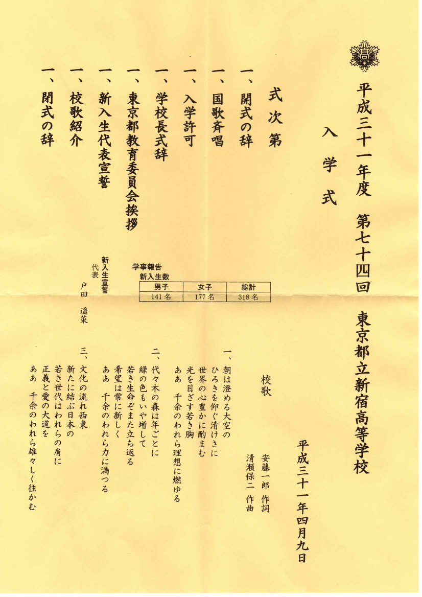 男子141名、女子177名、合計318名の新入生が、晴れて憧れの新宿高校の門をくぐりました。