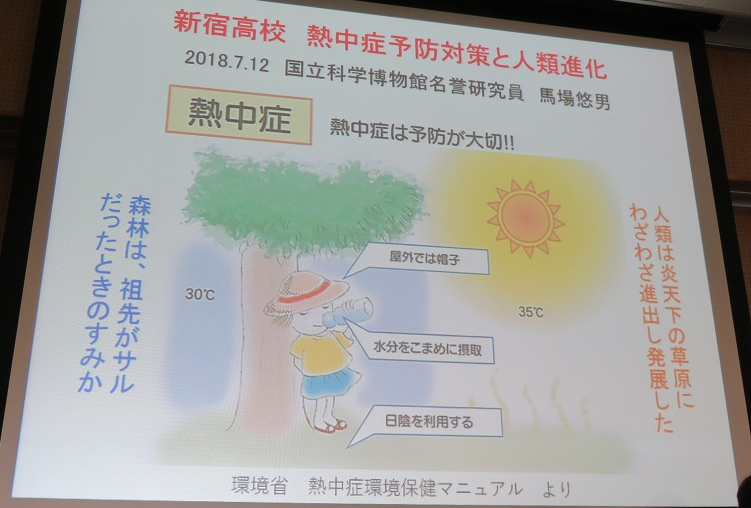 馬場さんは、近年大きな健康上のリスクとなっている「熱中症」の発症メカニズム、罹ったときの対処法、治療法などを環境庁の資料を使いながら、自身の熱帯での調査体験を交えて説明した後、人類学者からの視点で以下の通り述べた。
