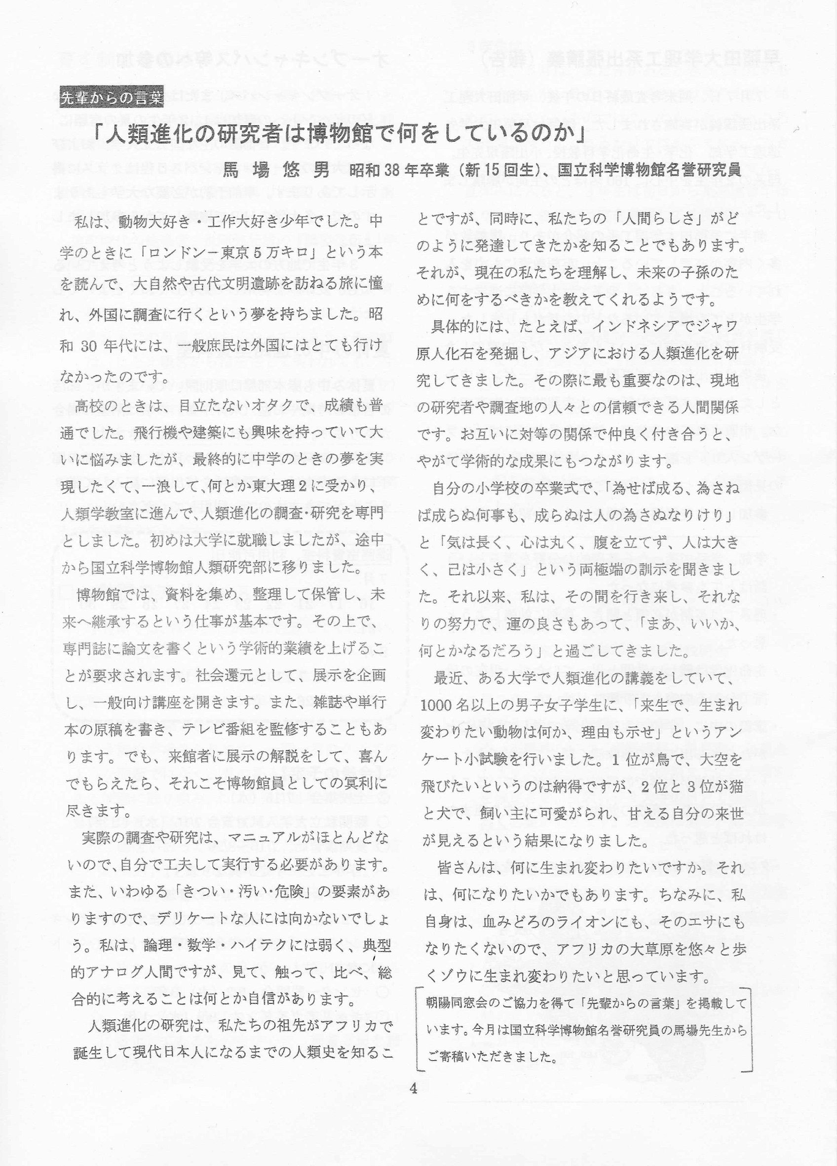 母校キャリア教育強化の一環として、進路指導部がこの4月から創刊した『進路部通信―新宿進化』の第4号に15回 馬場悠男さん(国立科学博物館名誉研究員)が「人類進化の研究者は博物館で何をしているのか」と題して寄稿されています。