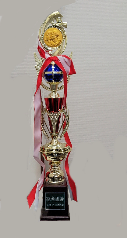 写真は、総合優勝のトロフィーですが、戸山高校同窓会城北会と朝陽会が折半で昨年購入したものです。