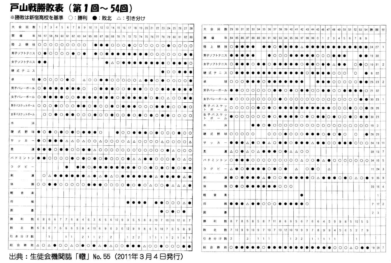 | 戸山戦勝敗表(第55回~60回) | *勝敗は新宿高校を基準 ○:勝利 ●:敗戦 △:引き分け | ||||||||||||||