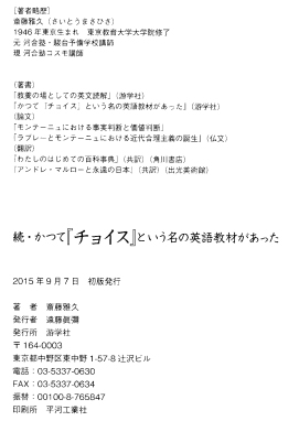 後に同じ駿台で『チョイス」を教材に英語を教えた経験を持つ齋藤さんは、本書で『チョイス』を参照しながら本文のより深い理解のために[考察]を加え、この[考察]を端緒として読者が本格的に書物に向かい「知の世界」に足を踏み入れてくれること、そして何よりあの懐かしい『チョイス』の雰囲気を味わって頂きたいと願って本書を執筆したとのことです。