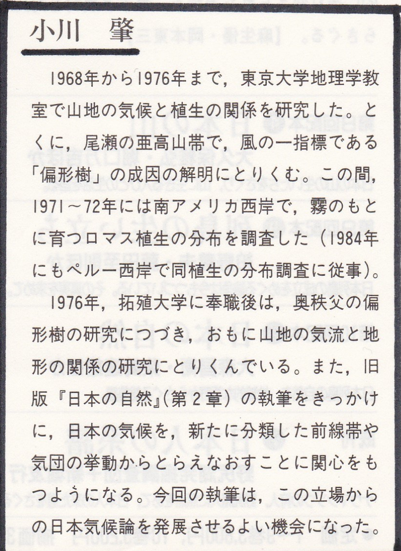 小川肇さんは東京大学理学部で地理学、理学系研究科で気候学を専攻、日本学術振興会奨励研究員で研鑽を積まれた後は、拓殖大学商学部共通教養系教授として研究生活を送られるとともに、商学部に学ぶ学生を長く指導されました。 今回寄贈いただいた両著書の表紙とともに、内容理解の一助として『日本の自然②』の「はじめに」と「あとがき」、小川さんの研究経歴が載った『日本の気候景観』編著者紹介を以下に示します。 「はじめに」と「あとがき」はこちらをクリックしてください。