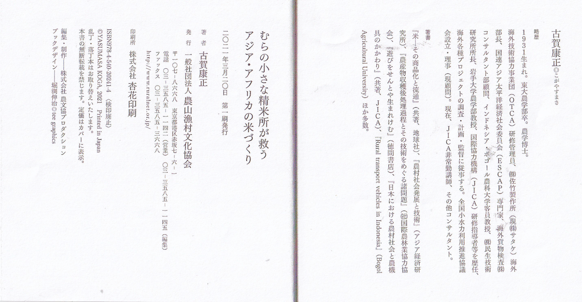 古賀康正さん(3)から新著(共著)『村の小さな精米所が救うアジア・アフリカの米づくり』(一般社団法人 農山漁村文化協会発行 2021年3月20日第一刷)を寄贈頂きました。