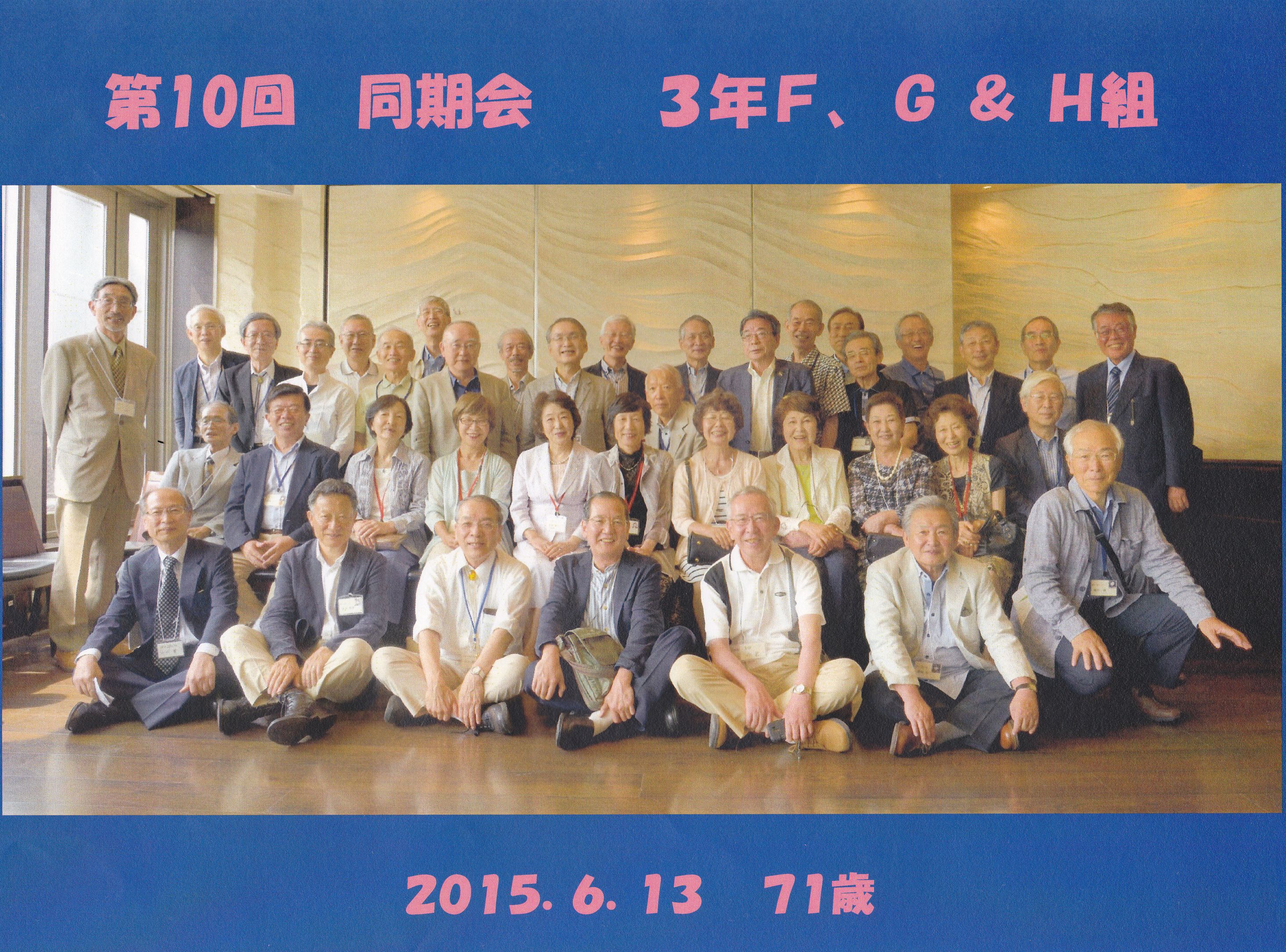 司会はクラス幹事持回りによって今回はF秋山小南君とC引間美登里さん。前回同期会から今日までに亡くなった旧友に黙とうを捧げたのち、同窓会長を務めている垂水尚志君の挨拶、母校100周年記念事業実行委員長の24回宮崎直道さんの挨拶。待ちに待った乾杯発声は恒例によって最遠方参加者の中川英邦君。セレモニーは初参加者、久々の参加者の挨拶以外は特になく、参加者は次々と話し相手を変えながら、在学時代の思い出話に、お互いの近況に、健康を確かめ合いつつ歓談に花を咲かせた。そして、あっという間に時間は去り、一・二次会合わせて4時間、みんなの顔が赤く染まる午後4時、次回はまた元気で会おうとお互いの肩をたたき合って散会した。
