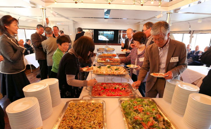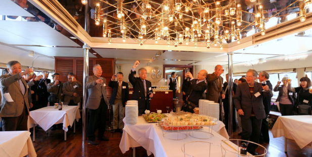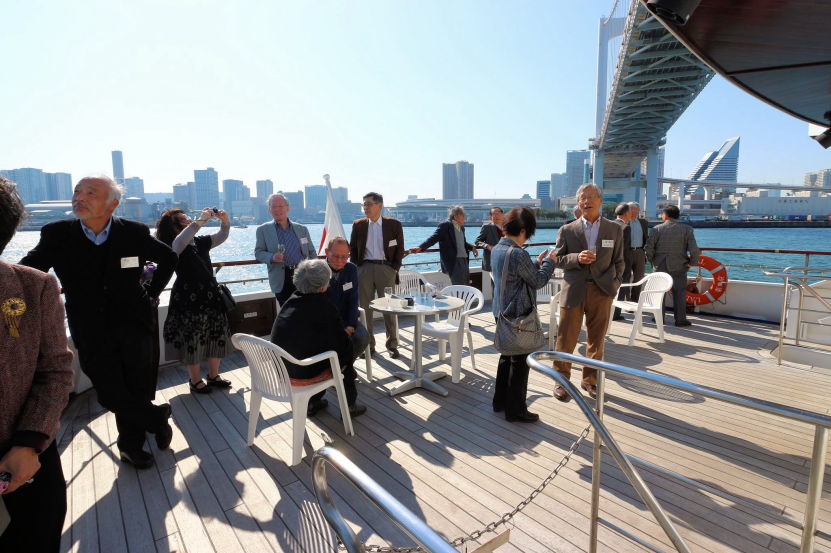 好天に恵まれ総会セレモニーの後、船をバックに(元キャノン)関口和也君の協力で全員の記念写真を撮影、(元日本郵船)松尾實君の協力でチャーターした “レディクリスタル号”に世界一周船旅に出発する気分で乗船、オリンピック選手村予定地等も見える湾内を一周、我々と同世代の様にお元気な北地節夫先生にもご参加戴きました。