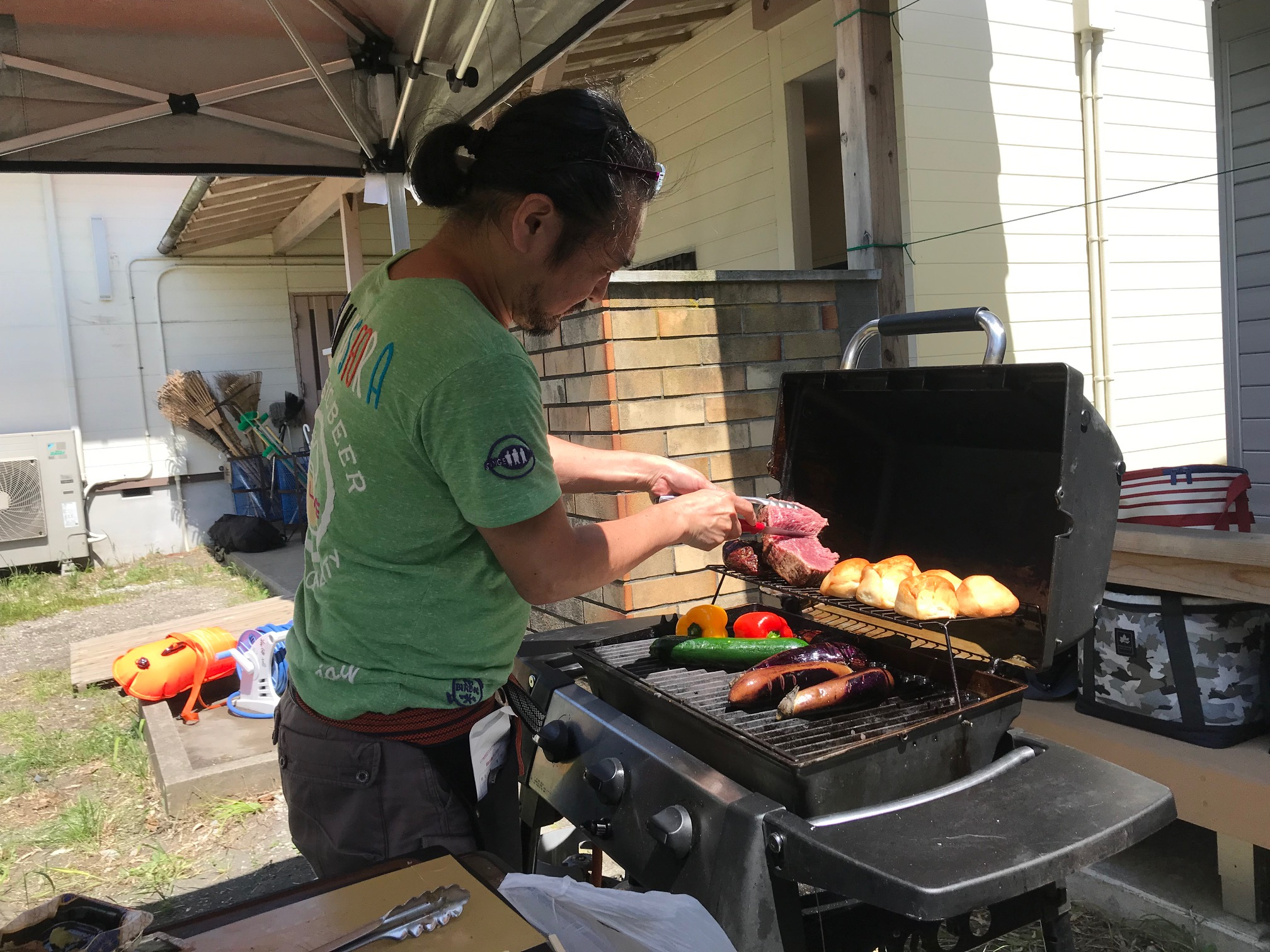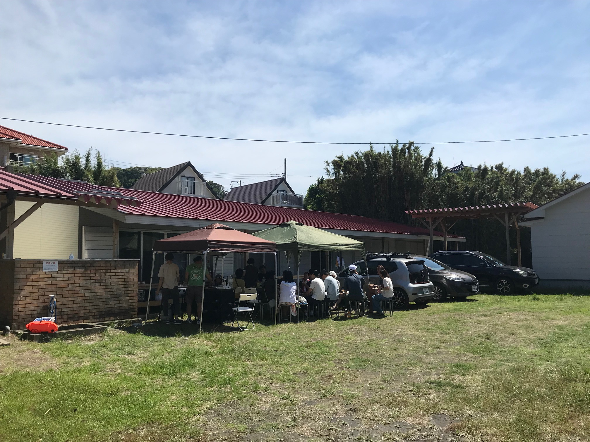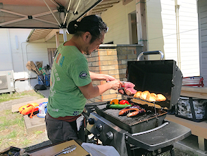 女子棟前でバーベキューの支度