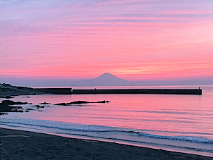 寮の前の浜からは美しい夕景の富士山