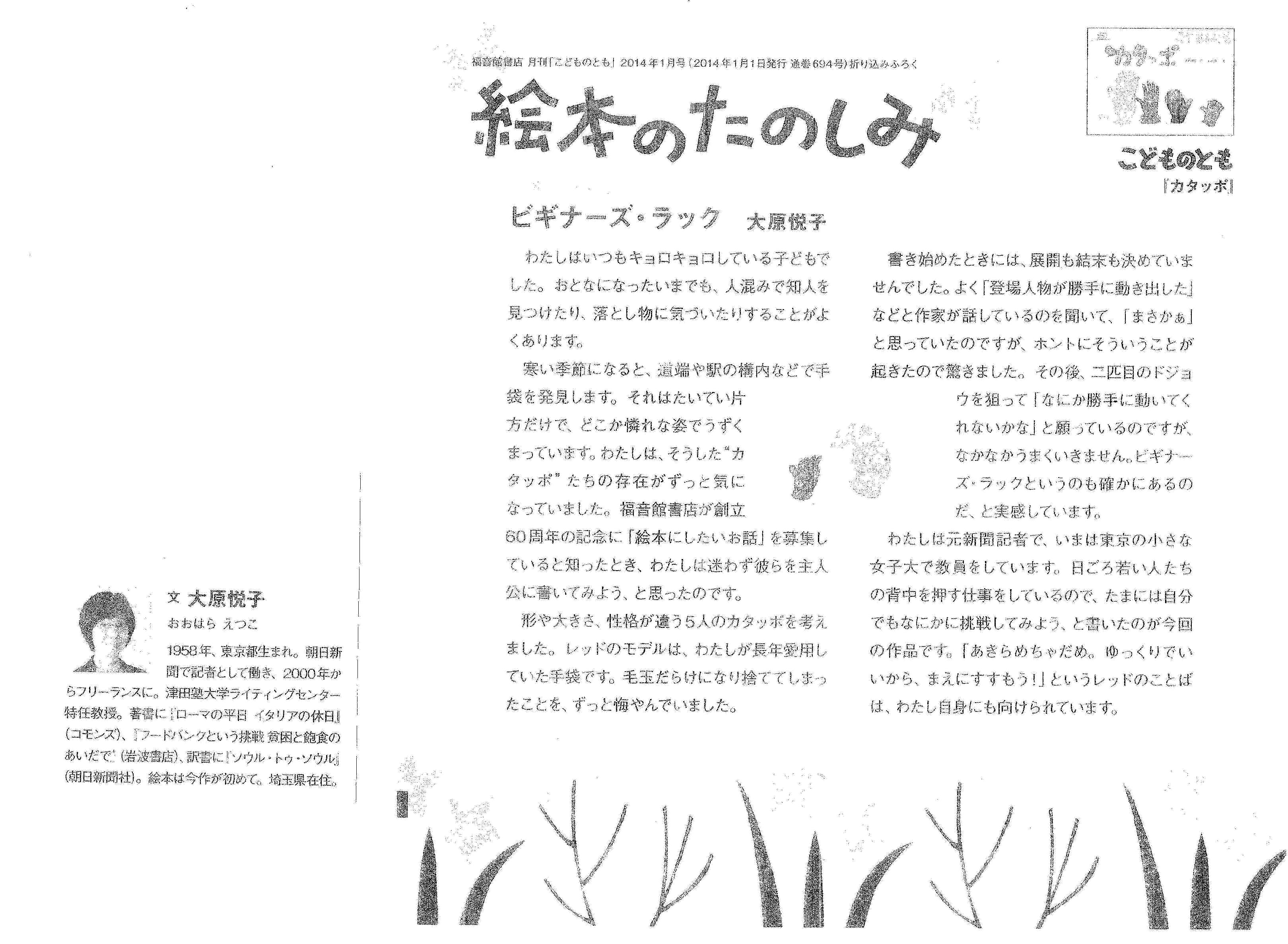福音館は長年にわたって良質な児童書を提供している。この書店が創立60年を記念して、「絵本にしたいお話」の原稿を募集したところ、29回生(昭52卒)の大原悦子さんの文章が採用になった。それがこの『ガタッポ』である。