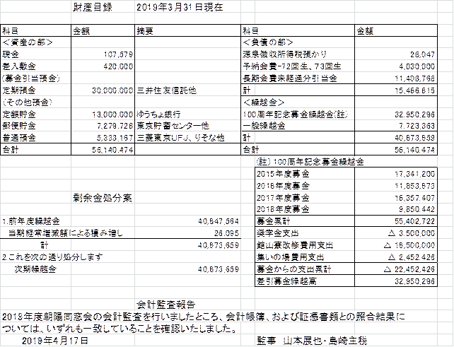 ・募金累計 5千5百万円 3月 ・大口寄付者へ働きかけ開始 ・13名に支給 ・朝陽会館の代替案模索 ・卒業生からの寄贈を期待 ・事業準備室開設 9月 ・朝陽秋川荘検討開始 1月 ・代表幹事会方針承認 2月 ・財団理事会承認 3月 ・第1回自主公演開催 3月 ・準備委員会開催 6.9.12.3月 ・準備委員会発足 1月 ・場所は京王プラザホテル ・800名の着席パーティー ・編集委員会発足 3月 ・編集方針決定 3月 ・運動部文化部OB会参加 11月 ・180名参加 11月 |