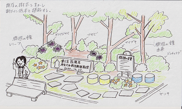 母校創立百周年を記念して母校校庭に記念庭園を設置を企画しています。完成は2023年9月末を予定しています。