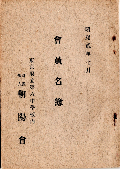 最初に発行された名簿は1927年(昭和2年)のもので、現在の朝陽同窓会の前身である東京府立第六中学校内財団法人朝陽會が作成しました。この名簿には当時すでに卒業していた六中1回生から6回生迄が含まれます。