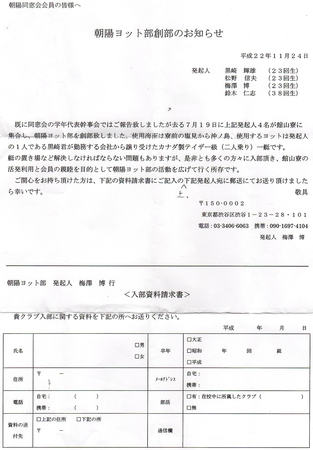 去る7月19日(月)に発起人4名が館山寮に集合し、朝陽ヨット部を創部しました。詳しくお知りになりたい方、また入部ご希望の方は梅澤博さん(23回)までご連絡ください。●朝陽ブリッジ倶楽部活動開始(平成22年11月25日掲載)