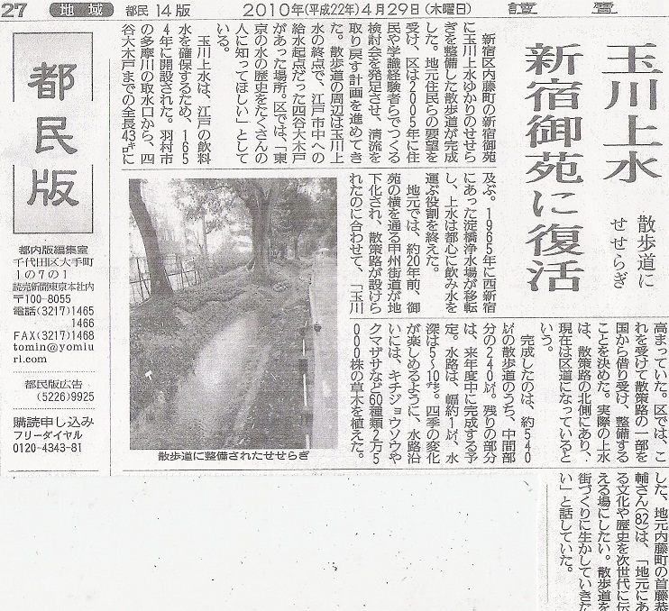地元住民の要望を受け区では東京の水の歴史を広く知ってもらうため、清流を取り戻す計画で半分弱まで整備は進み、来年度中には完成の予定です。(読売新聞都民版2010.4.29付参照)●第22回代表幹事会開催(平成22年5月14日掲載)