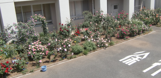 校庭の花壇には、ミスターローズとしてバラ愛好家には世界的に著名な鈴木省三さん(中5回)、京成バラ園芸で日本を代表する現役のバラ育種家として活躍中の武内俊介さん(39回)が育種し国際コンクールで優勝した日本のバラなど約100株が一斉に花を開き、生徒、教職員の皆さんの目を楽しませてくれています。