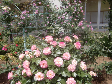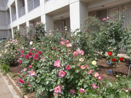 これらのバラは、一昨年で発足30周年を迎え、会員もPTA・OBを加えて100名を越えた朝陽バラ会の会員有志が、PTAバラ会のメンバーと共に月2回手入れ作業をするなどして、毎年立派な花を咲かせてくださっています。