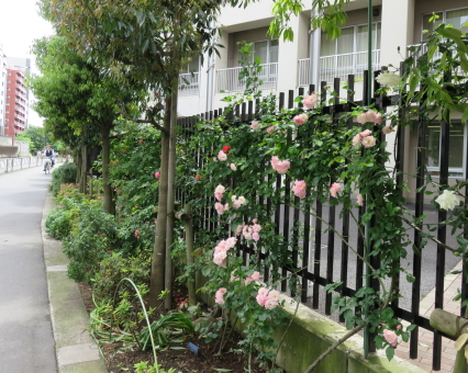 また、校門両側の塀で咲き誇るつるバラには、足を止めて見入っている多くの通行人の方が見受けられます。
